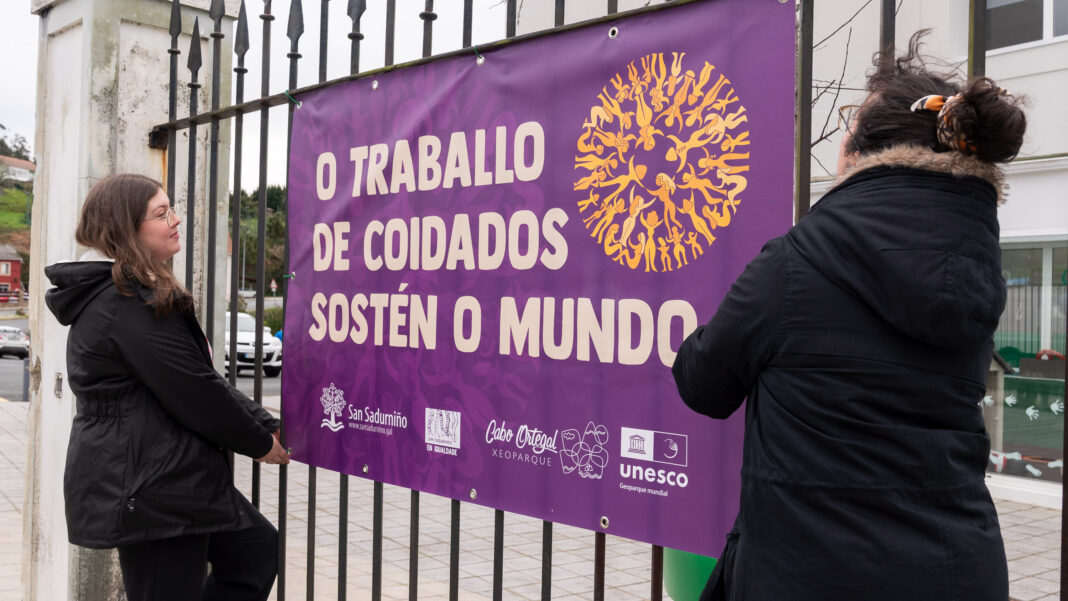 O Concello de San Sadurniño únese á celebración do 8M, Día Internacional da Muller, cunha serie de actividades que xa comezaron o luns coa apertura da exposición de acuarelas de Saila Chao e que continuaron hoxe co pendurado de mandilóns no enreixado da casa consistorial, onde tamén quedou colgado o lema das actividades deste ano: “O traballo de coidados sostén o mundo”