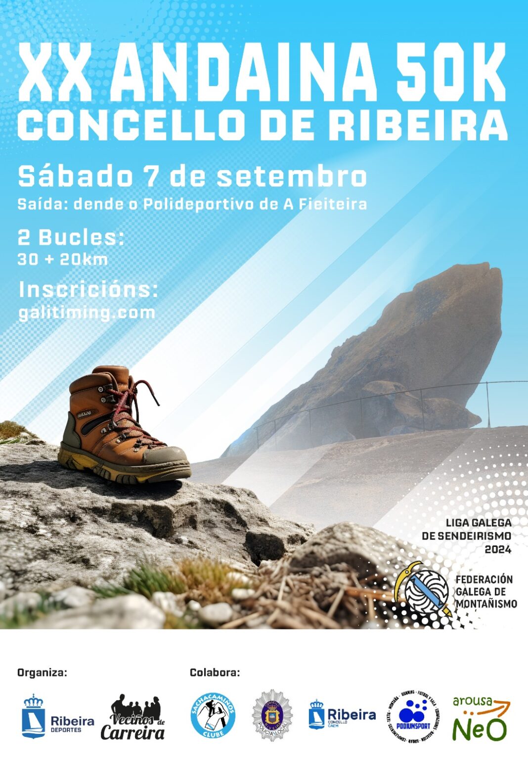 A XX edición da “Andaina de 50 K Concello de Ribeira”, celebrarase o sábado 7 de setembro, e constará de dous bucles (30 + 20 km) que comezaran e rematarán, ambos percorridos, no Complexo Deportivo Municipal A Fieiteira.