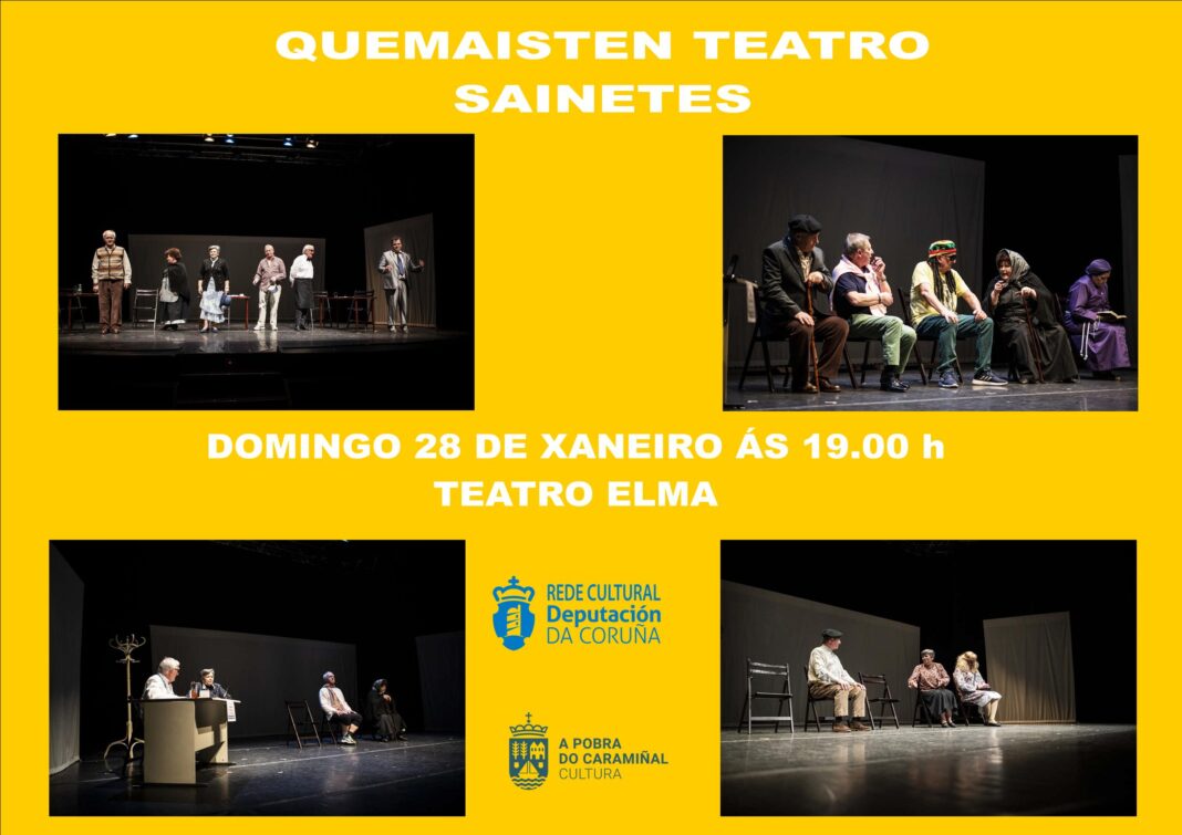 A Asociación Cultural Quemaisten Teatro, das Pontes, porá en escena Sainetes, composicións breves ou longas, xeralmente nun acto e de temas humorísticos, que reflicten os costumes populares e que se representaban antigamente a continuación dunha sesión de teatro. Os aquí presentes son obra do dramaturgo contemporáneo José Cedena, con O parque de María Risa; Peporro o do porro e os seus amigos da segu; A consulta do doutor Melquiades; e Un palillo pal diente.