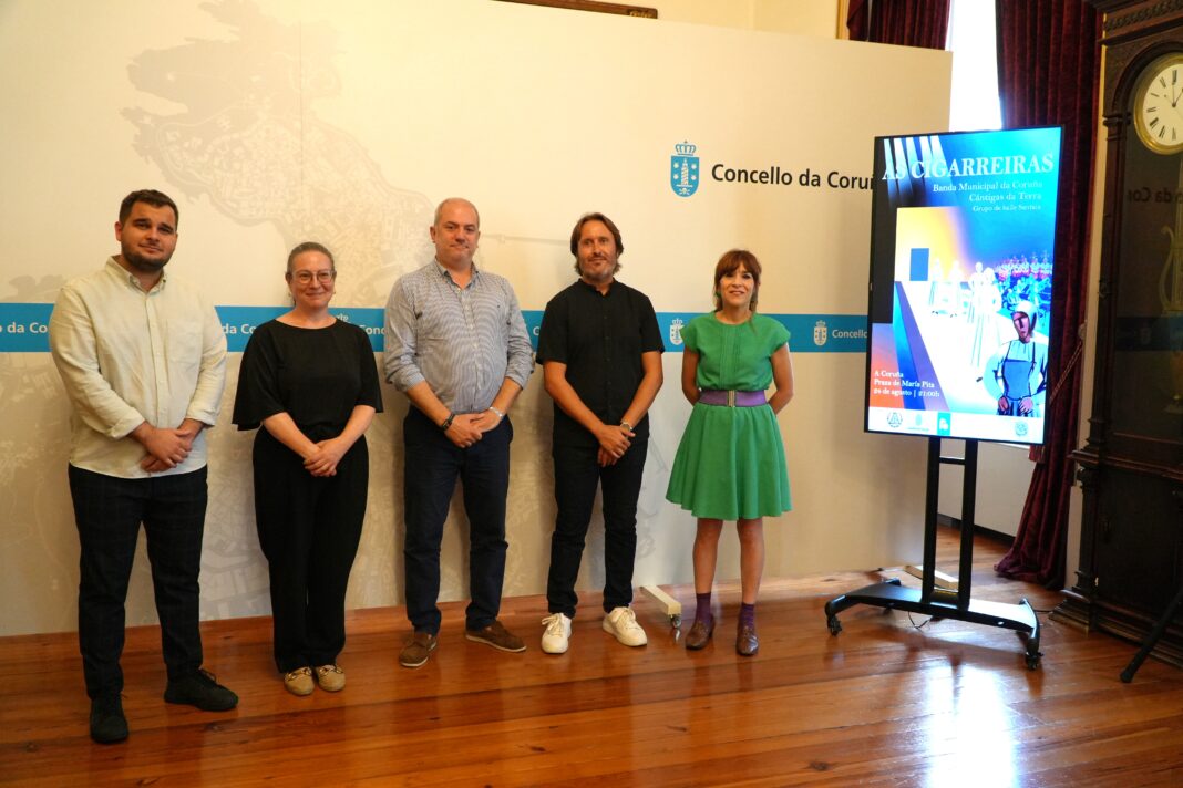 A Banda Municipal da Coruña e o Coro Galego Cántigas da Terra unirán forzas artísticas o próximo domingo 24 de agosto na praza de María Pita para brindarlle ao público coruñés un espectáculo único: ‘As cigarreiras’. Esa noite, máis de cen artistas subirán ao escenario para recrear -a través da música e do teatro- a pioneira revolta obreira protagonizada polas cigarreiras coruñesas da Fábrica de Tabacos da Palloza o 7 de decembro de 1857. Explicárono así esta mañá en rolda de prensa o concelleiro de Cultura e Turismo, Gonzalo Castro, o director da Banda Municipal da Coruña, Juan Miguel Romero Llopis, e o director artístico de Cántigas da Terra, Luís Bolón, que tamén é compositor e o responsable dos arranxos musicais do espectáculo.