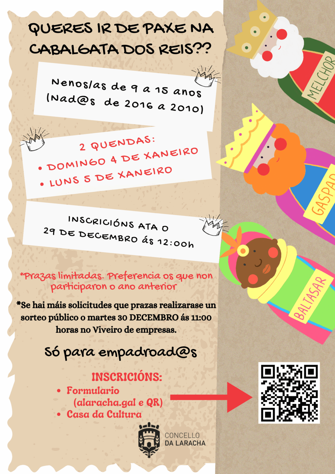 Todos os nenos e nenas empadroados no Concello, que teñan entre 9 e 15 anos (nados de 2010 a 2016) e que desexen vivir esta experiencia tan especial acompañando a Melchor, Gaspar e Baltasar como paxes xa poden preinscribirse ata as 12:00 horas do día 29 de decembro. O trámite xa pode realizarse en liña cubrindo o formulario dispoñible na páxina web municipal www.alaracha.gal e nas redes sociais do Concello, ou tamén de maneira presencial nas dependencias municipais.