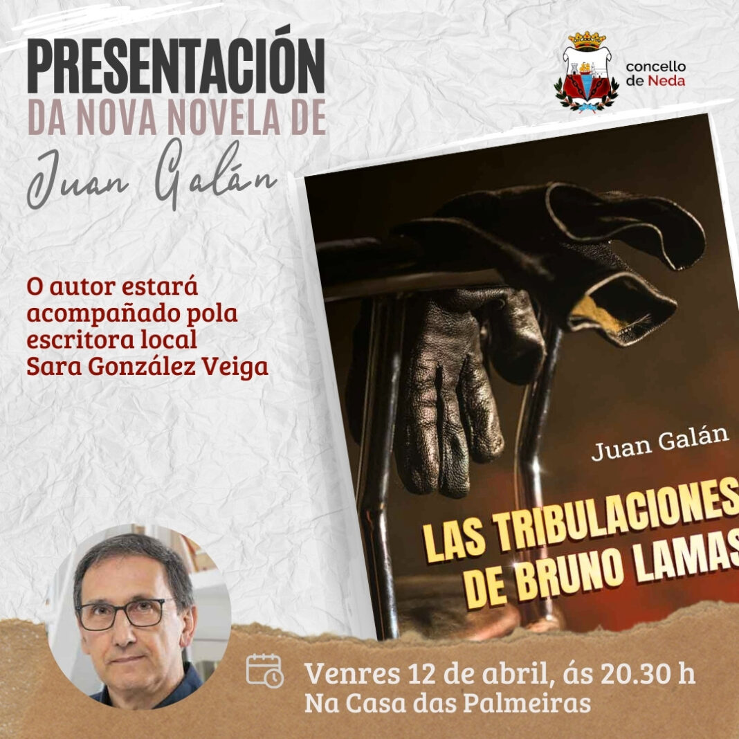 En plena celebración do mes do libro, o Concello de Neda programa este venres, a partir das 20.30 h, unha nova presentación literaria na Casa das palmeiras. Desta volta, Juan Galán achegarase á vila para falar do seu último libro, o thriller Las tribulaciones de Bruno Lamas.