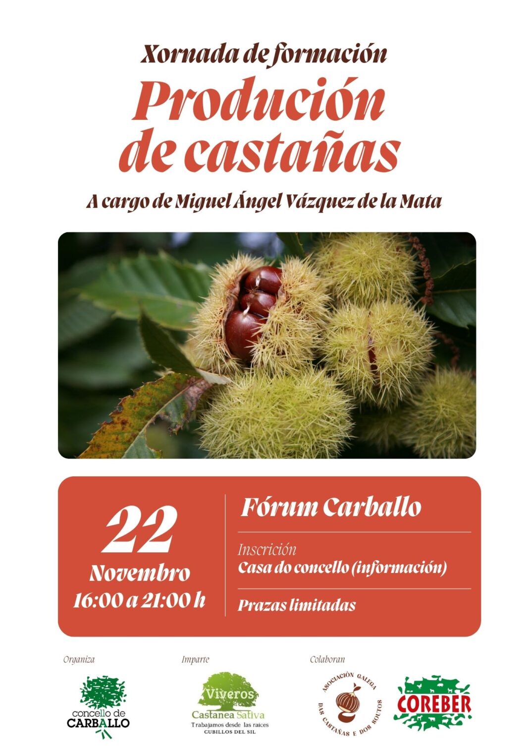 A Concellaría de Medio Ambiente organiza unha xornada de formación sobre produción de castañas, unha iniciativa na que contamos coa colaboración da Asociación Galega das Castañas e dos Soutos e de Coreber, e que será impartida por Miguel Ángel Vázquez de la Mata, de Viveros Castanea Sativa (Cubillos del Sil-León).