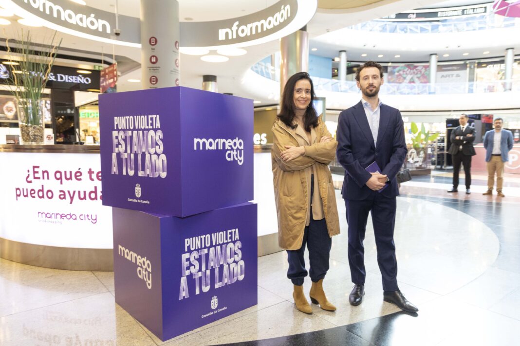A concelleira responsable da Área de Benestar Social, Yoya Neira, participou esta mañá na posta en marcha do punto violeta que instalou o centro comercial Marineda City. A edil estivo acompañada de Arnaud Leroy, director Asset Management de Merlin Properties para Marineda City, así como por persoal técnico da Concellaría e outros responsables do centro comercial.