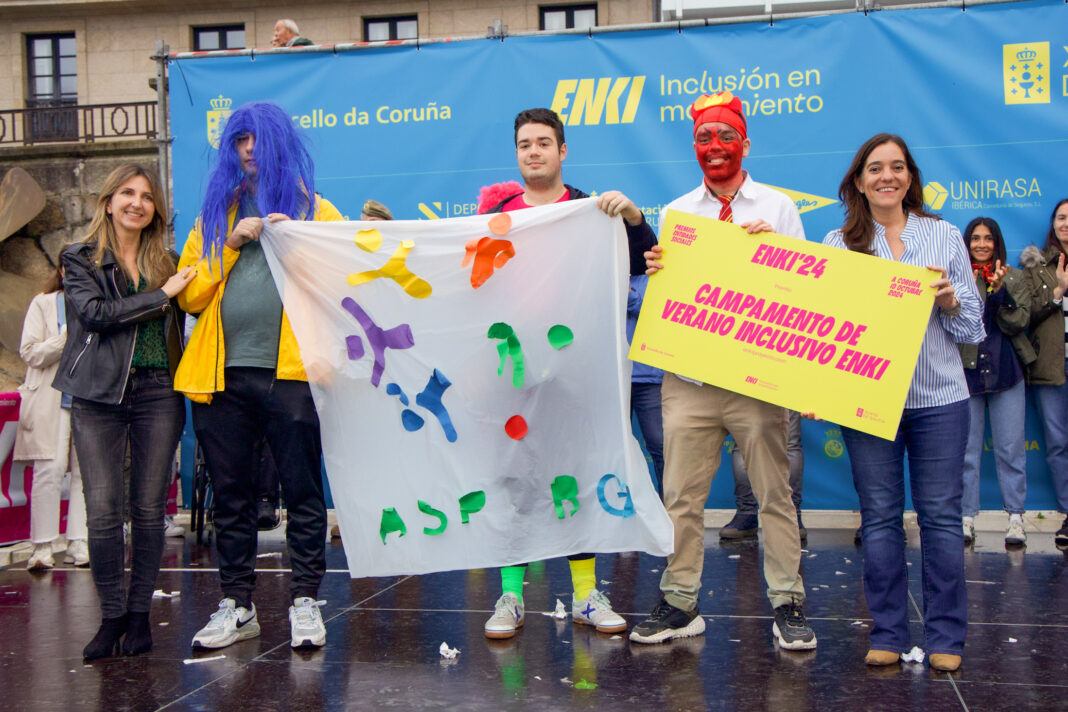 A alcaldesa, Inés Rey, e a concelleira de Benestar Social, Igualdade e Participación, Nereida Canosa, acompañadas por por Ángel López e Carmen Touza, presidente e xerente da Fundación ENKI, respectivamente, participaron a continuación no acto de entrega de premios posterior á carreira, que recoñeceron ao equipo máis numeroso, ao disfrace máis orixinal e tamén ao máis animado, entre outros.