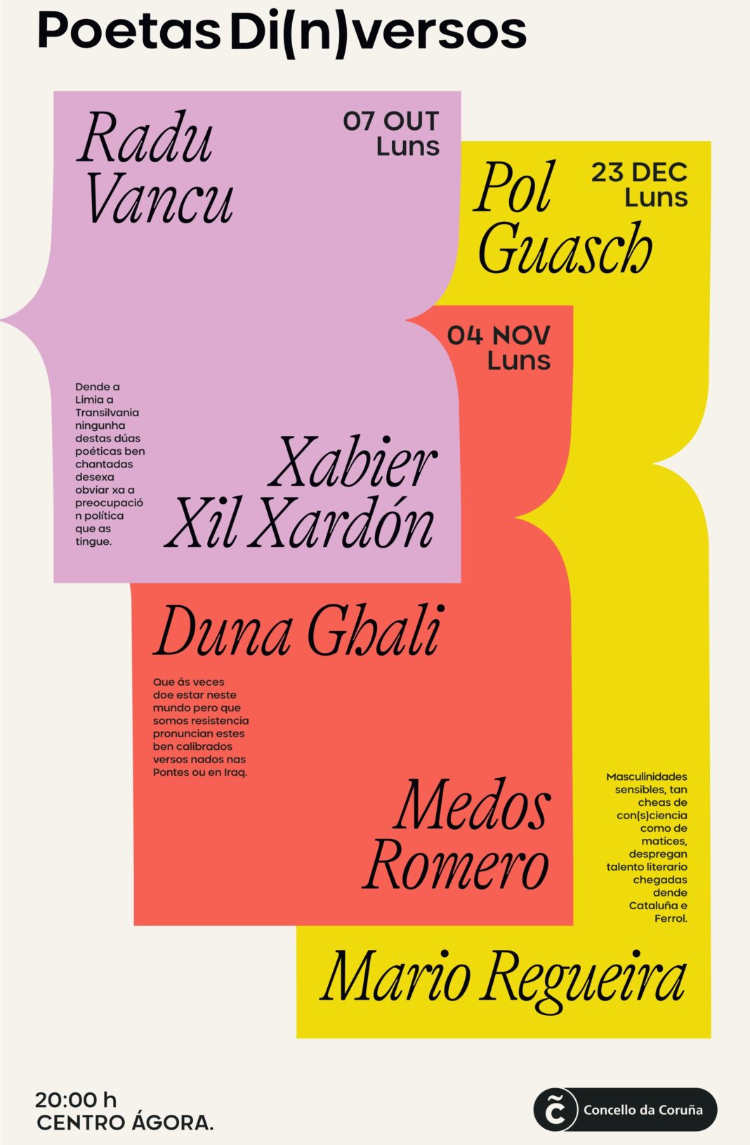 Á cita de outubro seguiralle o recital da consagrada autora en lingua árabe Duna Ghali e da premiada co Miguel Glez.-Garcés e o Premio Afundación de Poesía, Medos Romero. A iraquí e a pontesa compartirán escenario do Ágora o luns 4 de novembro. Para rematar o ano e os primeiros tres meses de lecturas, o luns 23 de decembro tomarán o relevo o ferrolán Mario Regueira, un dos críticos literarios galegos de maior relevo ademáis de poeta e narrador, e unha das voces máis fulgurantes e prometedoras da nova literatura catalá, Pol Guasch.