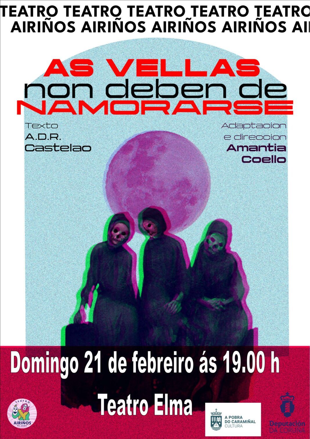 Teatro Airiños, de Rianxo, levará ás táboas do Elma a función As vellas non deben de namorarse, no 21 de xaneiro, ás 19.00 horas. Este é un cambio que se produce no cartel do ciclo de teatro afeccionado, pois a compañía prevista para esa xornada tivo que suspende-la función por motivos de saúde dunha das actrices principais.
