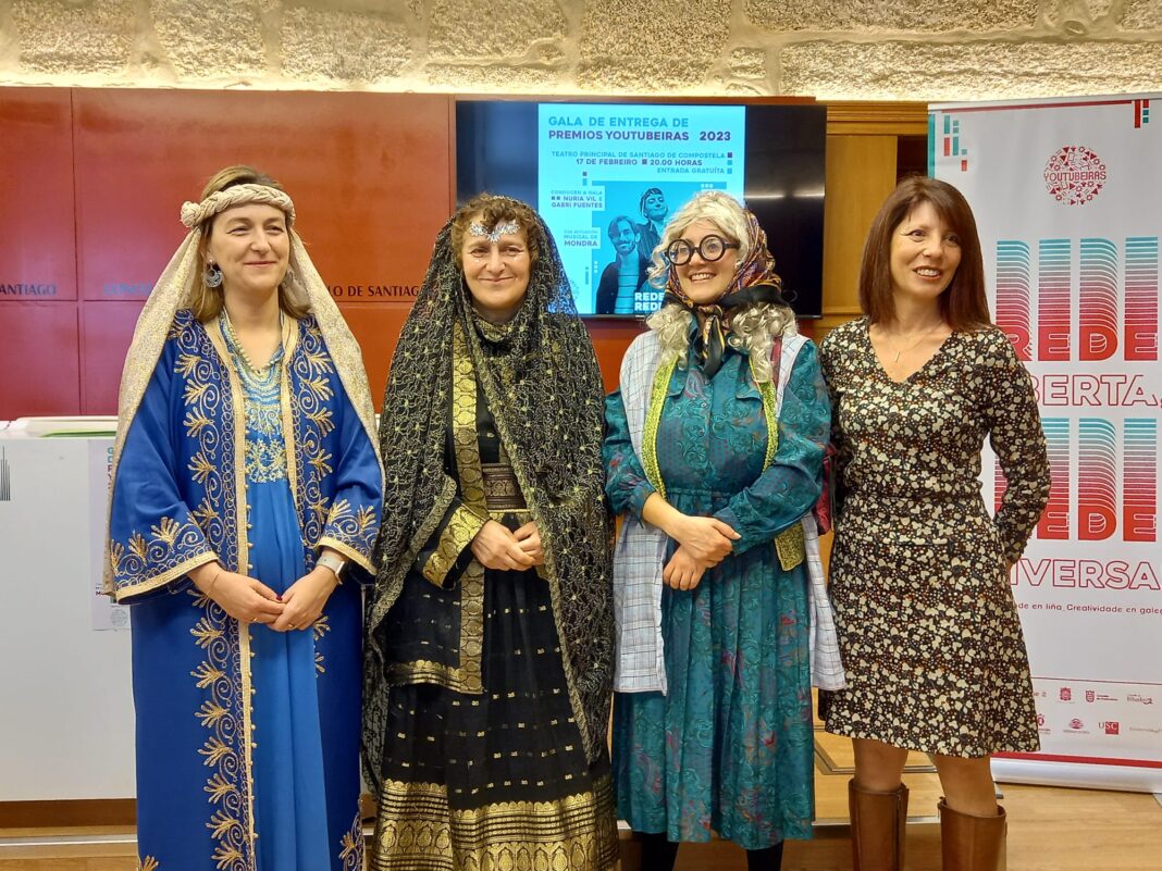 Youtubeiras, proxecto organizado polos servizos de Normalización Lingüística dos concellos de Ames, Carballo, O Grove, Moaña, Pontevedra, Ribadeo, Rois, Santiago e Teo, das tres universidades galegas e da Deputación da Coruña co obxectivo de fomentar a creación en galego no YouTube con temáticas e formatos diversos, así como de promover e visibilizar os diferentes perfís de persoas xeradoras de contidos na Rede, fará entrega dos Premios Youtubeiras 2023 este sábado, 17 de febreiro. A gala celebrarase no Teatro Principal de Santiago e contará coa condución de Nuria Vil e Gabri Fuentes e coa actuación musical de Mondra. Así o adiantaron esta mañá en rolda de prensa a alcaldesa de Santiago de Compostela, Goretti Sanmartín; a deputada de Normalización Lingüística da Deputación da Coruña, Soledad Agra, e Nuria Vilán Prado (coñecida co nome artístico de Nuria Vil) quen se encargou de explicar diferentes detalles da gala.