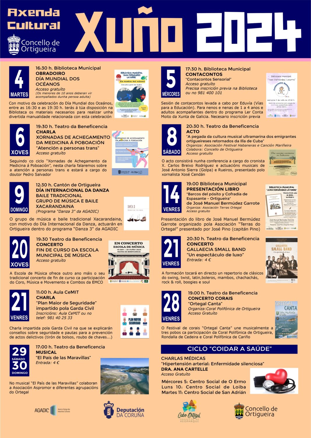 O Concello de Ortigueira acaba de anunciar a súa axenda de actividades culturais para o mes de xuño, no que ofrece aos veciños e veciñas unha ducia de eventos repartidos durante todo o mes, nos que a música será a gran protagonista.