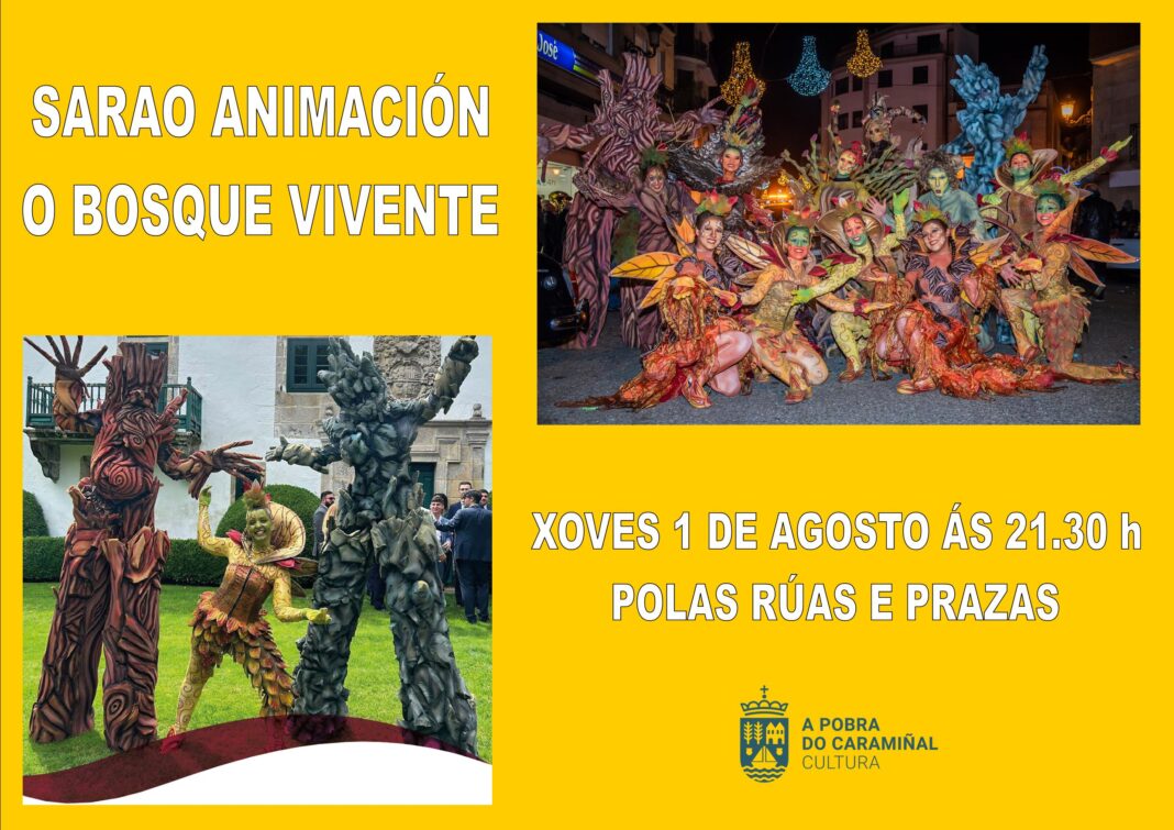 A animación de rúa correrá a cargo de Sarao con O bosque vivente, no 1 de agosto, das 21.30 horas en diante, polo núcleo urbano. Trátase dunha experiencia única que transcende as barreiras do tempo e a imaxinación. Este relato máxico itinerante desenvólvese nun albergue de peregrinos do Camiño de Santiago, onde un ancián comparte unha historia que cambiará a percepción da natureza para sempre.