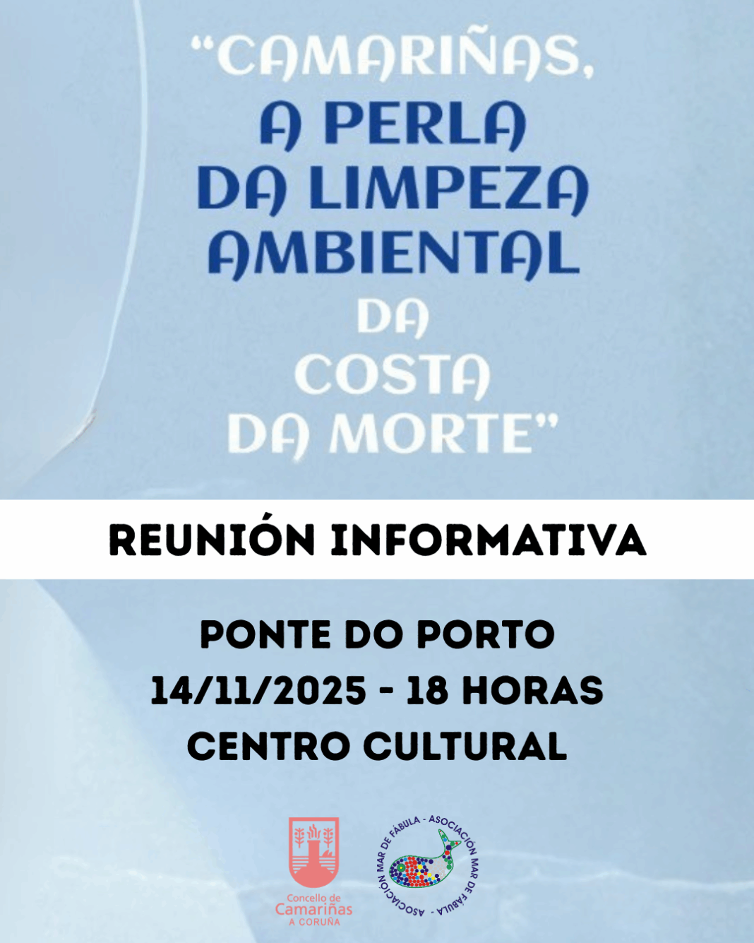O Concello de Camariñas, en colaboración coa asociación Mar de Fábula, organiza este venres, 14 de novembro, ás 18 horas na Ponte do Porto, concretamente no Centro Cultural, a terceira reunión informativa sobre a campaña de concienciación ambiental coa que se pretende sensibilizar á veciñanza sobre a importancia de non tirar nada ao mar e de protexer o medio mariño e o litoral do municipio.