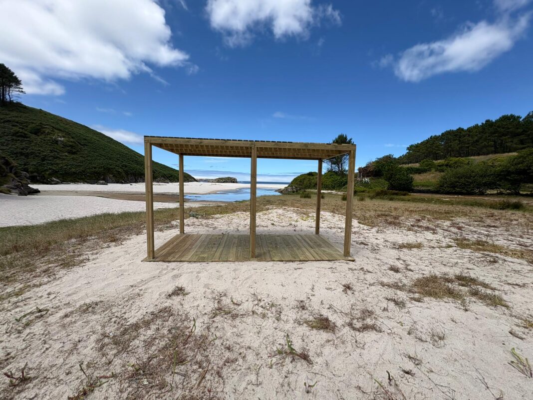 A actuación, executada con fondos municipais, consistiu na instalación dunha zona de sombra de madeira tratada e especialmente pensada para aquelas persoas con mobilidade reducida ou de idade avanzada poidan gozar dun espazo protexido do sol dentro do propio areal. Deste xeito, evítase que teñan que portar -especialmente as persoas con mobilidade reducida ou as súas familias- aparellos como parasoles para protexerse da radiación.