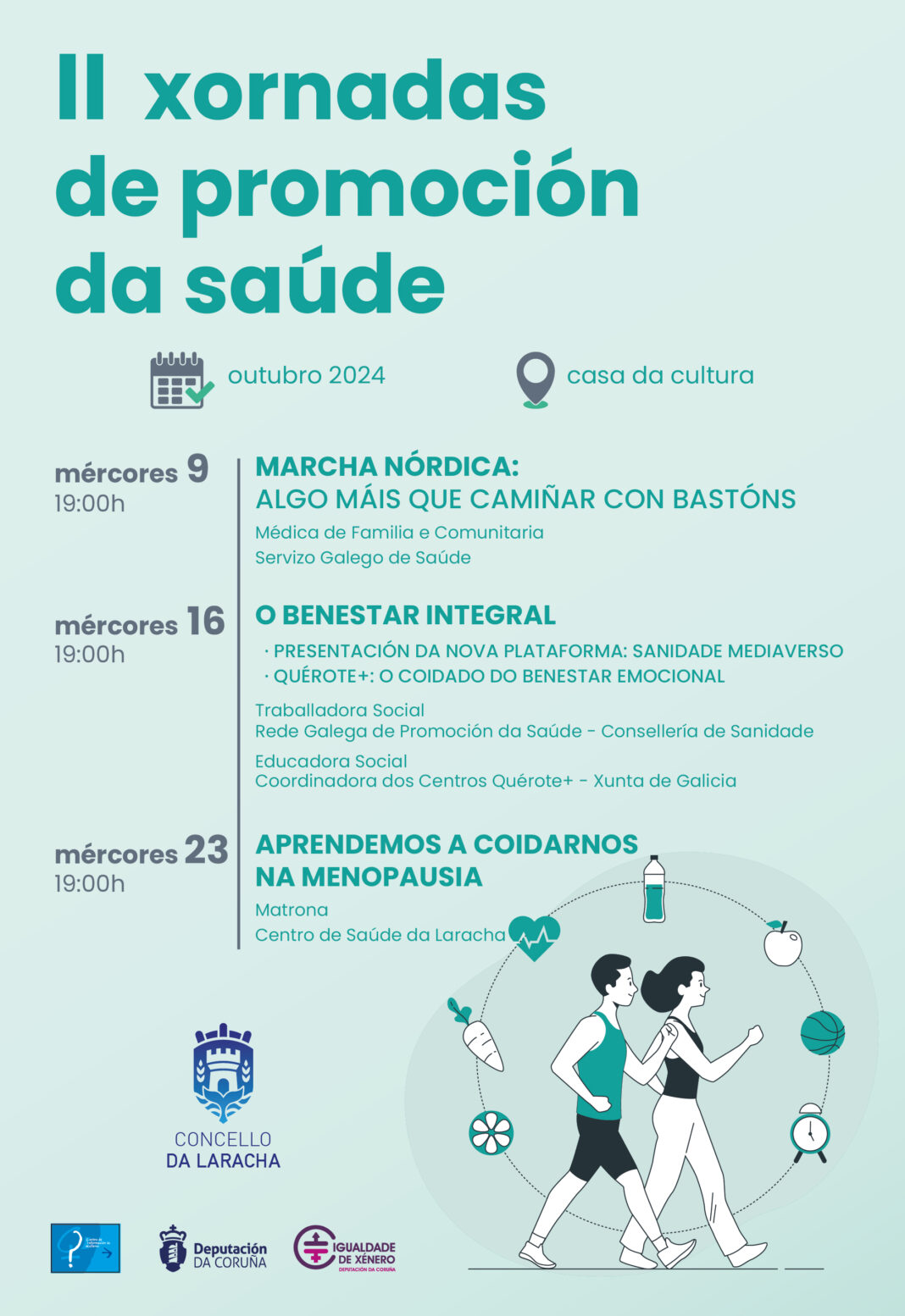 O programa consta de tres ponencias a cargo de profesionais de sectores relacionados coa saúde e a educación social. Levaranse a cabo ao longo do mes de outubro, sempre na Casa da Cultura da Laracha e con inicio ás 19:00 horas.