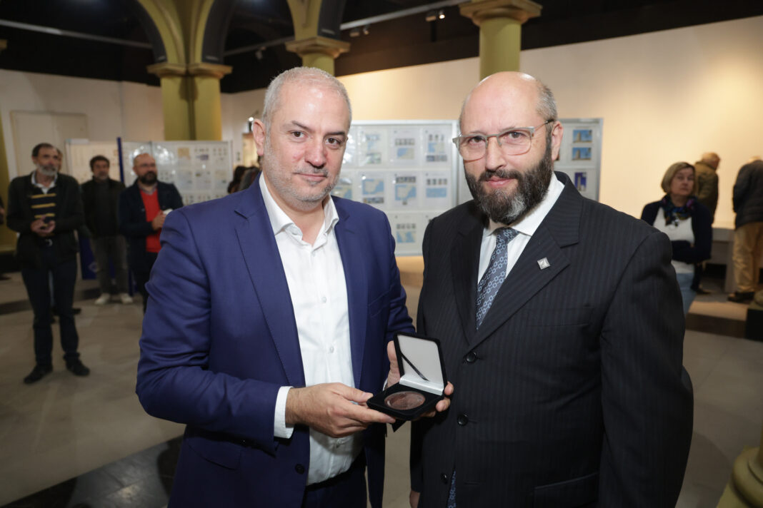 Gonzalo Castro e José Luis Rey, presidente da entidade, cularon un sobre conmemorativo e presentaron unha tarxeta especial cos data do evento. A mostra estará aberta ao público ate o 15 de decembro, con entrada de balde ate completar capacidade.