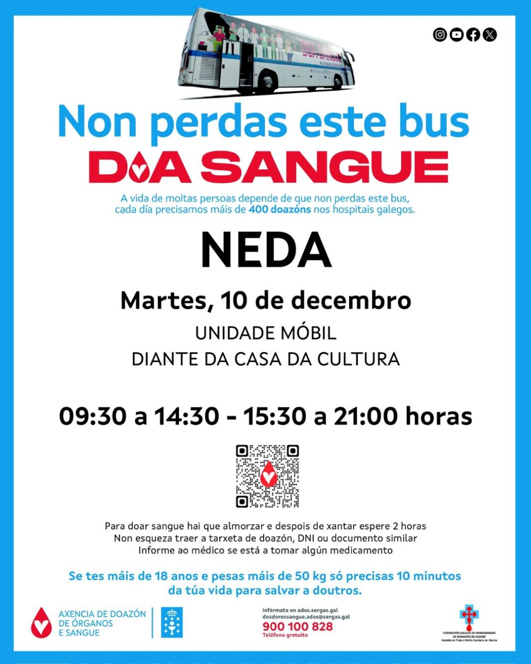 Unha unidade móbil da Axencia de Doazón de Órganos e Sangue (ADOS) desprazarase o vindeiro martes, 10 de decembro, ao Concello de Neda para facilitar que a veciñanza poida doar sangue sen ter que saír do municipio. A visita prodúcese coa vista posta no Nadal, un período no que aumentan os desprazamentos, e con eles os accidentes e urxencias médicas. O autobús estará situado diante da Casa da Cultura de 9.30 a 14.30 horas, e de 15.30 a 21 horas.