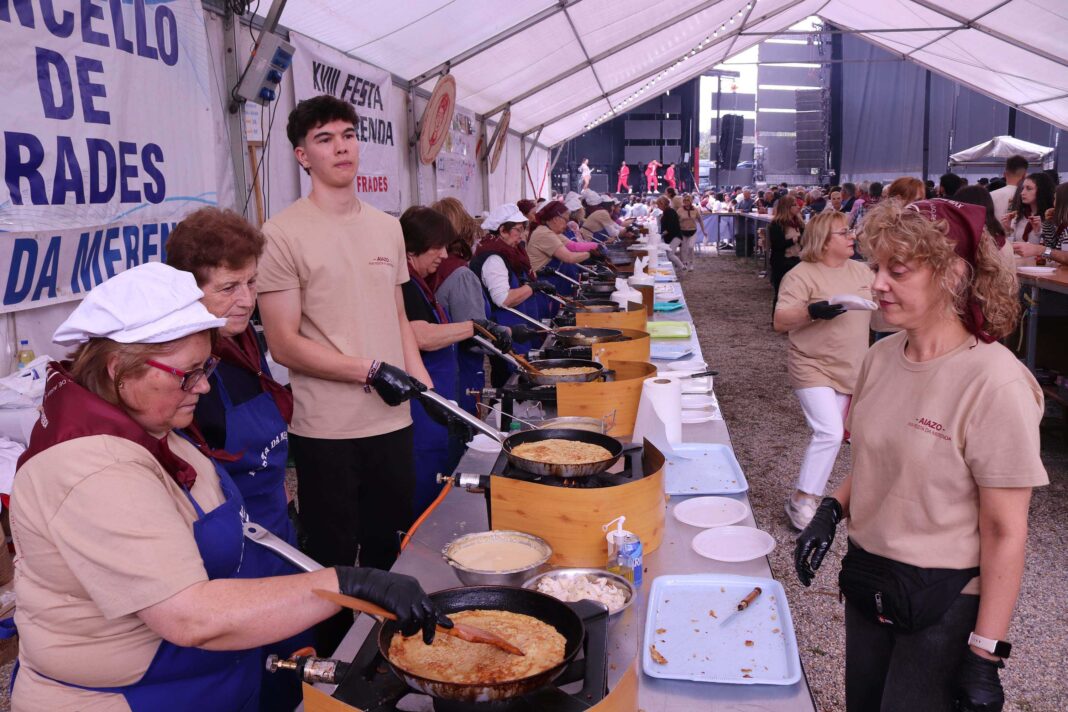 Dende o mediodía, unha trintena de cociñeiras da asociación veciñal comezarán a preparar as tortillas de masa, que se poderán degustar de balde con cada consumición ou comprar para levar en caixas de pizza. Unhas merendas elaboradas cunha base común a base de ovos, auga e fariña, pero ás que despois cada cociñeira dálle o seu toque persoal tanto polo grosor da tortilla, o tempo de cociñado ou por se as acompaña ou non de torriscos (láminas de touciño de porco).