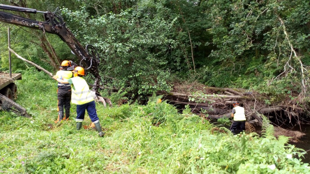 As tarefas consisten na retirada de árbores e biomasa presentes no leito do río para evitar atoamentos, así como na execución de labores de roza puntual e selectiva de arbustos no acceso á canle.