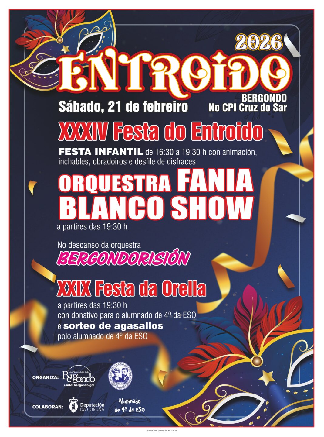 O Concello de Bergondo celebrará o vindeiro sábado, 21 de febreiro, na contorna do CPI Cruz do Sar o seu XXXIV Festa do Entroido e a XXIX Festa dá Orella nunha programación entroideira na que, ademais dos disfraces, a música e a animación, os asistentes gozarán da actuación dos mellores grupos do “BergondoRisión”.