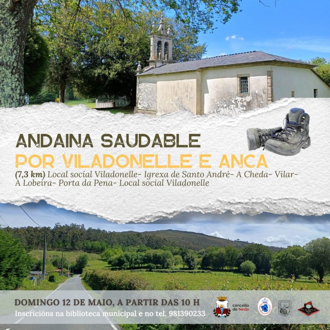 O Concello de Neda vén de pechar o percorrido da andaina saudable do mes de maio. A ruta circular, prevista para o día 12, a partir das 10 horas, discorrerá por puntos das dúas parroquias de interior do municipio, Viladonelle e Anca. Dende hoxe se abre a inscrición telefónica ou presencial na biblioteca municipal.