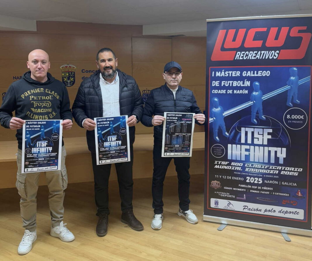 O Concello colabora coa asociación Infinity na primeira edición do Máster galego de futbolín Cidade de Narón, que se disputará os días 11 e 12 de xaneiro no pavillón do colexio de Piñeiros. O edil de Deportes, Ibán Santalla, presentou a convocatoria acompañado por Jesús Redondo, presidente de Infinity, e Esteban Freijo, presidente na zona do Ortegal da citada asociación. Dende a organización recalcaron que se repartirán 8.000 euros en premios e que a proba será clasificatoria para o mundial que se celebrará o vindeiro ano en Zaragoza.