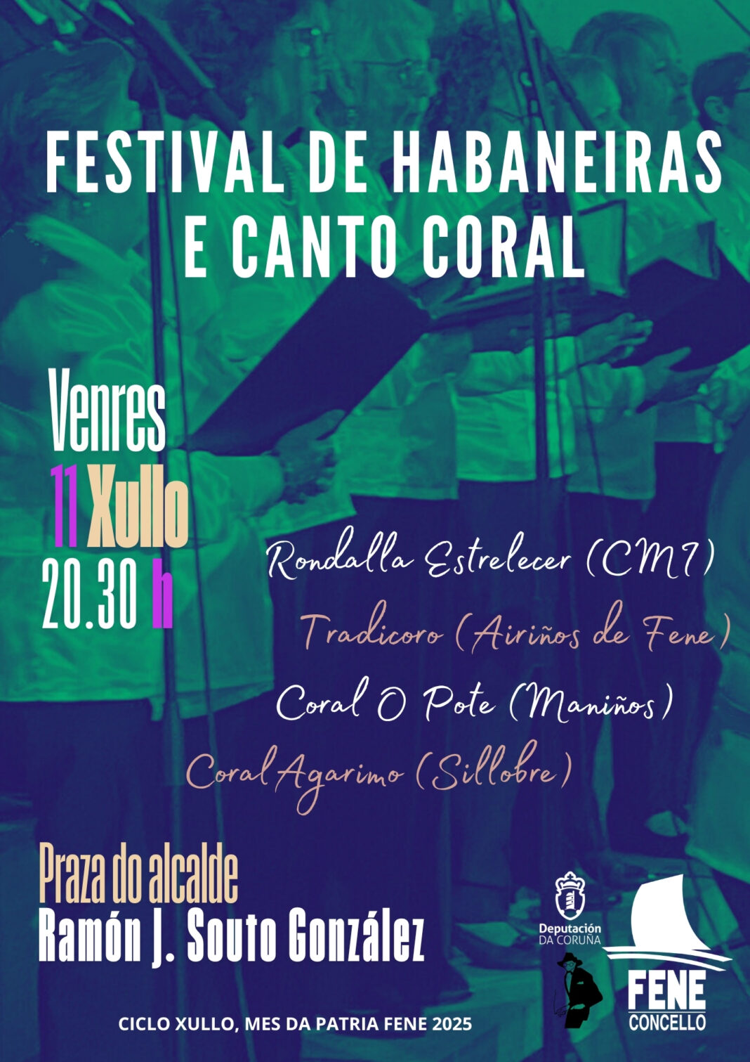 O ciclo Xullo, mes da Patria do Concello de Fene concluirá este venres 11 de xullo, ás 20.30 horas, co tradicional Festival de habaneras e canto coral no que as protagonistas serán as corais e rondallas do concello: a Rondalla Estrelecer (CMI), o Tradicoro (Airiños de Fene), a Coral Polifónica O Pote de Maniños e a Coral Agarimo de Sillobre. A cita será, novamente, na Praza do alcalde Ramón J. Souto Gonzalez.