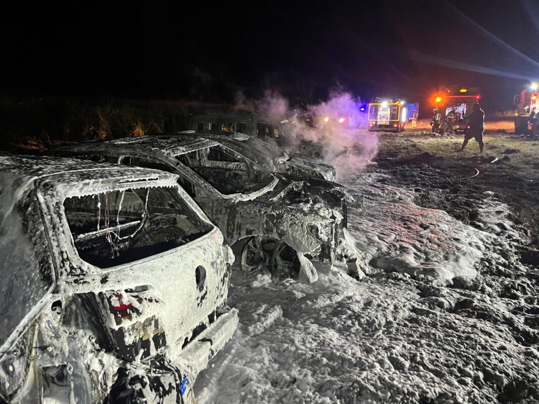 Os bombeiros do parque provincial do Boiro tamén tiveron que acudir ata Nadelas, en Queiruga, no concello de Porto do Son tras arder cinco vehículos. Non houbo feridos.