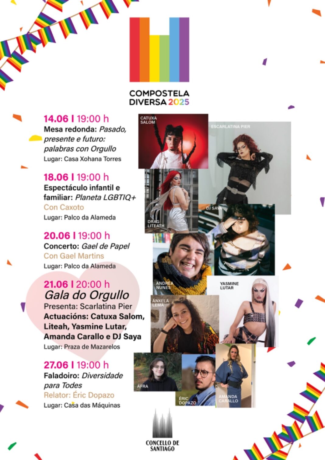 8. A Gala do Orgullo 2025, terá lugar na Praza de Mazarelos 21 de xuño a partires das 20 horas. Será dirixida este ano por Scarlatina Pier. E contaremos coas actuacións de Catuxa Salom, Liteah, Yasmine Lutar, Amanda Carallo e DJ Saya. Un serán para celebrar con orgullo, música e reivindicación a diversidade sexual e de xénero. Contaremos cun cartel de artistas que apostan pola liberdade escénica e a visibilización das disidencias: desde o pop ata a performance drag, pasando polo baile, o humor e a música electrónica.