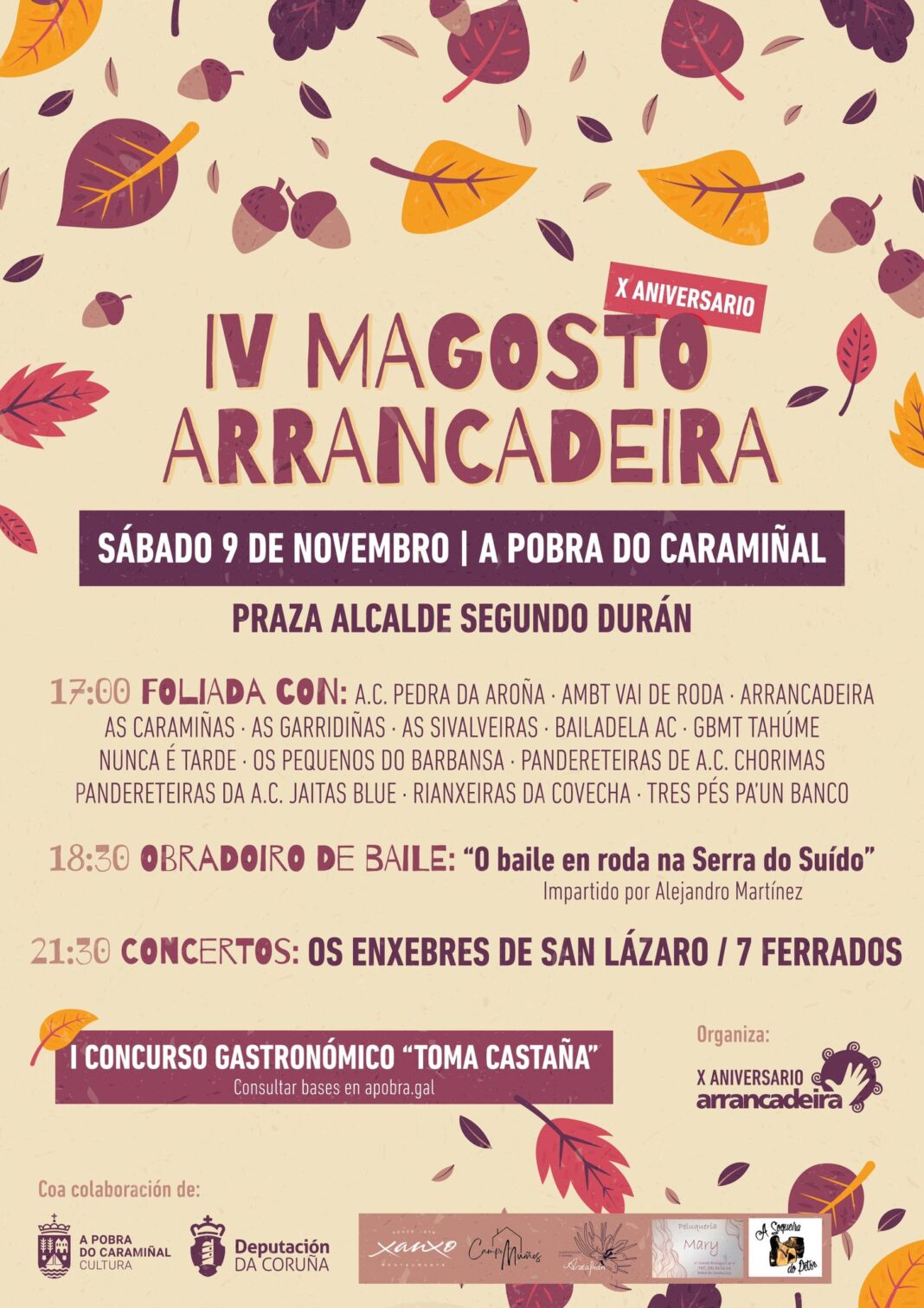 Tamén se bota a andar a primeira edición do concurso gastronómico Toma Castaña. Consistirá en elaborar pratos que leven a castaña entre os seus ingredientes. Presentarase no propia praza Alcalde Segundo Durán, no sábado 9, en horario de 16.00 a 17.00 horas. As persoas participantes deberanse inscribir previamente no enderezo electrónico arrancadeirapobra@hotmail.com con prazo límite ás 12.00 horas do 9 de novembro. Indicarase nome e apelidos, teléfono de contacto e nome e descrición da receita. O xurado determinará a elaboración gañadora e o premio será unha cea nun establecemento hostaleiro do municipio.