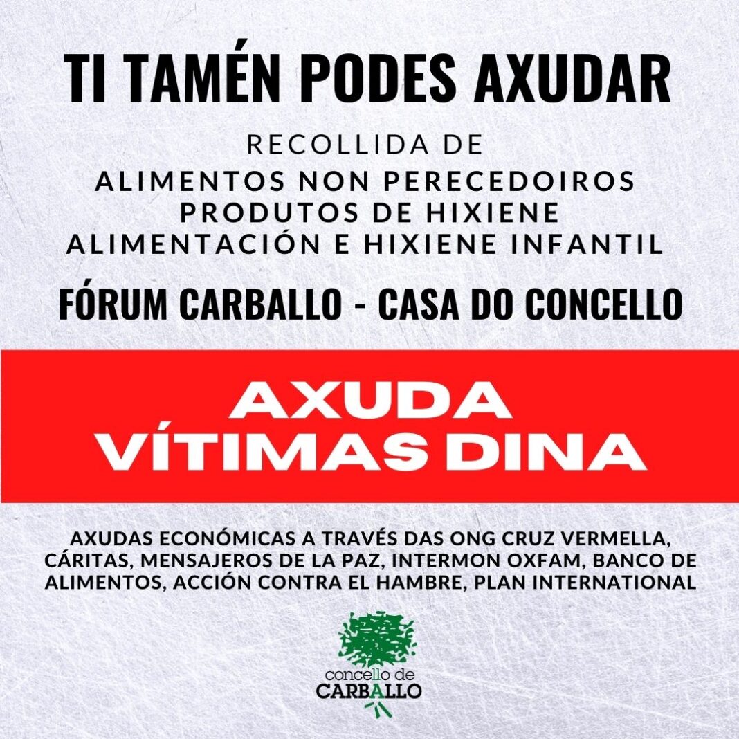 O Concello de Carballo amosa a súa solidariedade coas vítimas da DINA (Depresión Illada en Niveis Altos) e, despois de coñecer as necesidades dos municipios afectados, trasladadas pola Federación Valenciana de Municipios e Provincias, pon en marcha unha campaña de recollida dos seguintes produtos: