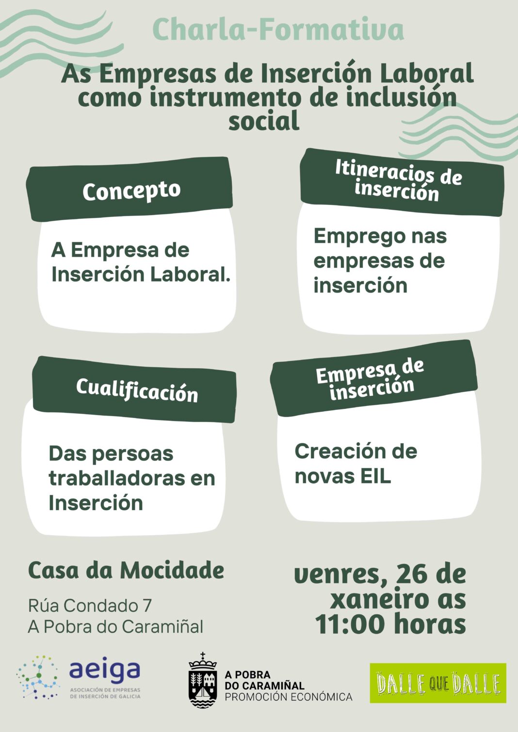 Este coloquio impartirase no 26 de xaneiro, ás 11.00 horas, na Casa da Mocidade da Pobra do Caramiñal da man da Asociación de Empresas de Inserción de Galicia (AEIGA), a Concellaría da Promoción Económica e a cooperativa Dálle que Dálle. A edil Amparo Cerecedo incide en que esta acción ten como finalidade “dar a coñecer esta alternativa de inserción no mercado laboral, especialmente pensada para colectivos de persoas en risco de exclusión social, polo cal tamén constitúen un instrumento con grandes potencialidades na loita a prol da cohesión social.”