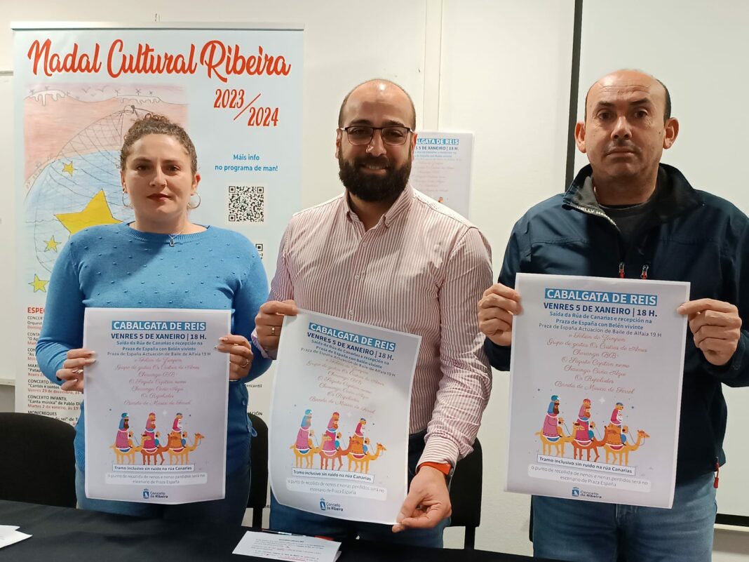Os edís Francisco Suárez-Puerta, Antía Alberte e Fernando Abraldes presentaron a cabalgata de Reis que terá lugar o vindeiro 5 de xaneiro a partir das 6 da tarde. As súas maxestades chegarán ao Porto de Ribeira nas embarcacións da Cofradía da Dorna e dende alí irán a pé ata a Rúa de Canarias, de onde sairá todo o desfile.