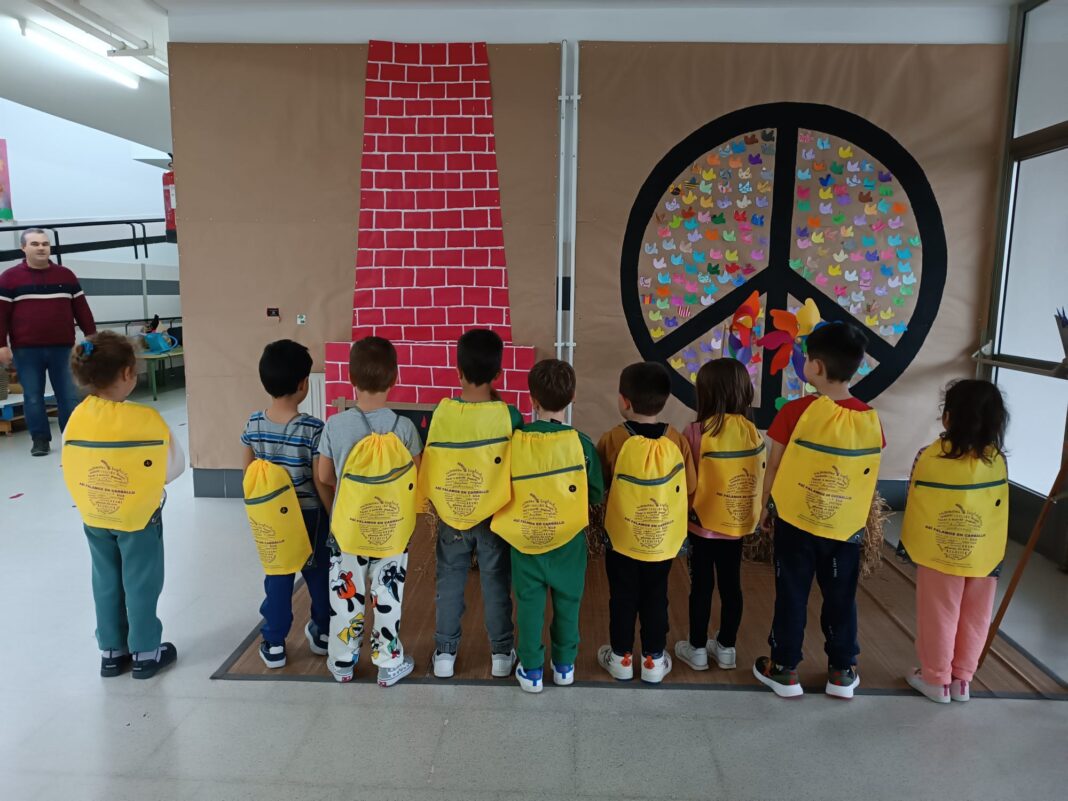 Para darlle visibilidade á iniciativa, e para premiar o traballo de recollida realizado polos nenos e nenas, preparamos unhas mochilas estampadas con moitas desas palabras, agrupadas en forma de landra, que tamén é unha palabra e un símbolo do noso concello. Hoxe entregámosllas á rapazada, que quedou súper contenta co agasallo.
