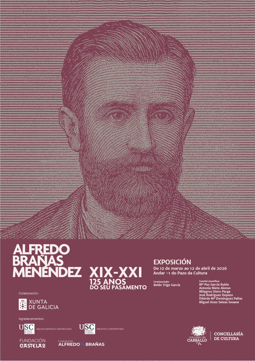 O Pazo da Cultura de Carballo acollerá desde o 12 de marzo ata o 12 de abril a exposición Alfredo Brañas Menéndez. XIX-XXI. 125 anos do seu pasamento, unha mostra que propón unha revisión contemporánea da figura do intelectual carballés.
