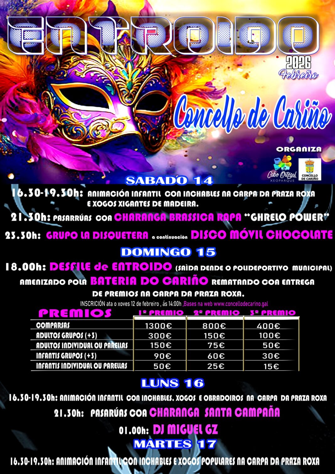 O prato forte chegará o domingo 15 de febreiro, coa celebración do tradicional desfile de disfraces, que partirá ás 18:00 horas desde o Polideportivo Municipal e estará amenizado pola Batería do Cariño. Neste desfile, que concluirá na praza Roxa, o Concello de Cariño repartirá 3.595 euros en premios a dividir entre os tres primeiros clasificados das distintas categorías.