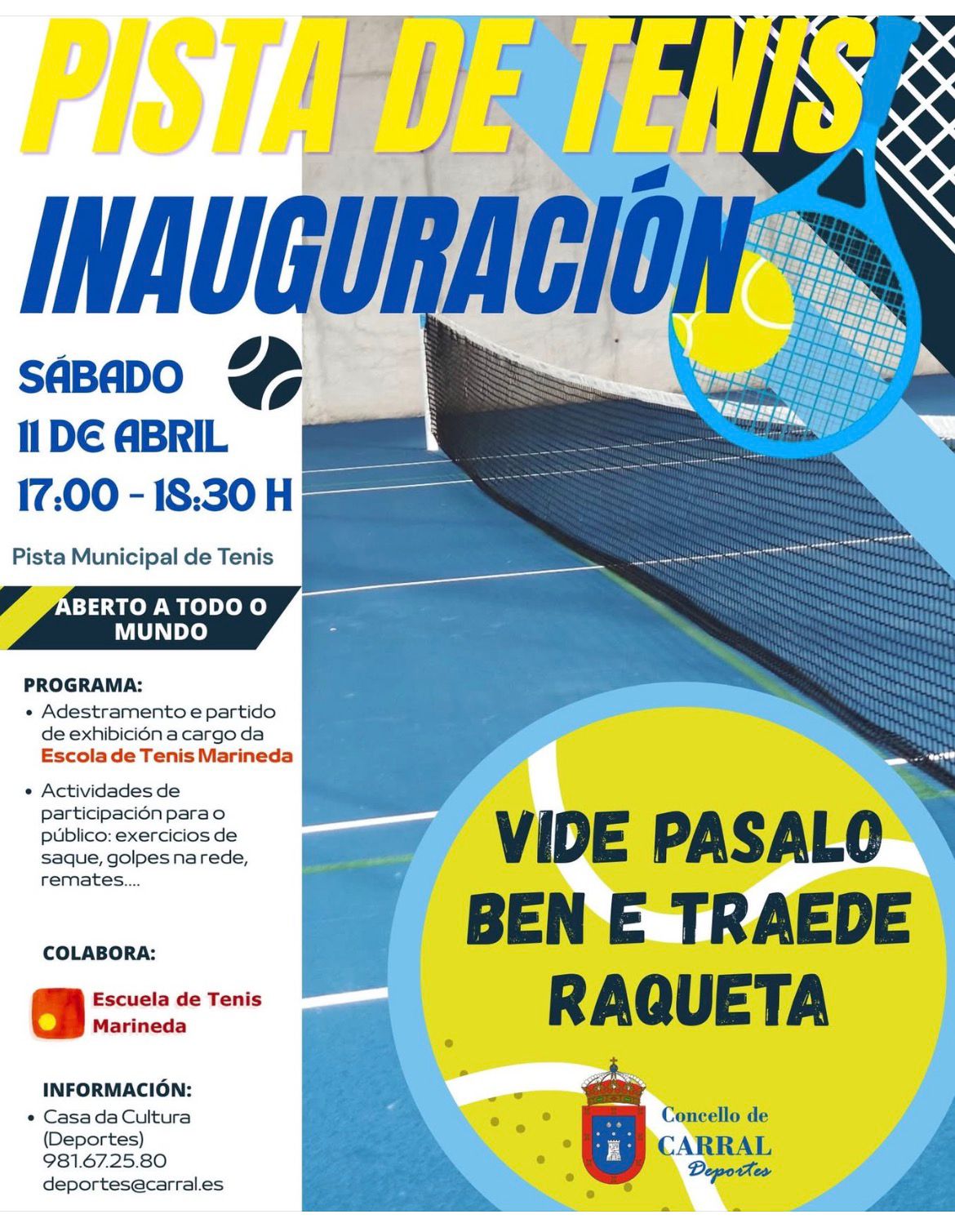 O vindeiro sábado 11 de abril, en horario de tarde, terá lugar a inauguración da pista municipal de tenis de Carral, nun acto aberto á cidadanía e concibido para achegar este deporte a veciños e veciñas dunha forma dinámica e participativa.