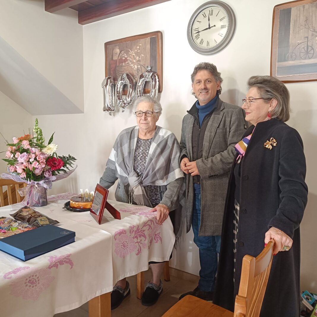 Rexedor e concelleira quixeron trasladar as felicitacións persoalmente, en nome de todo o Concello, así como facer entrega dun bonito detalle floral e unha placa a esta veciña que cumpre un século de idade.