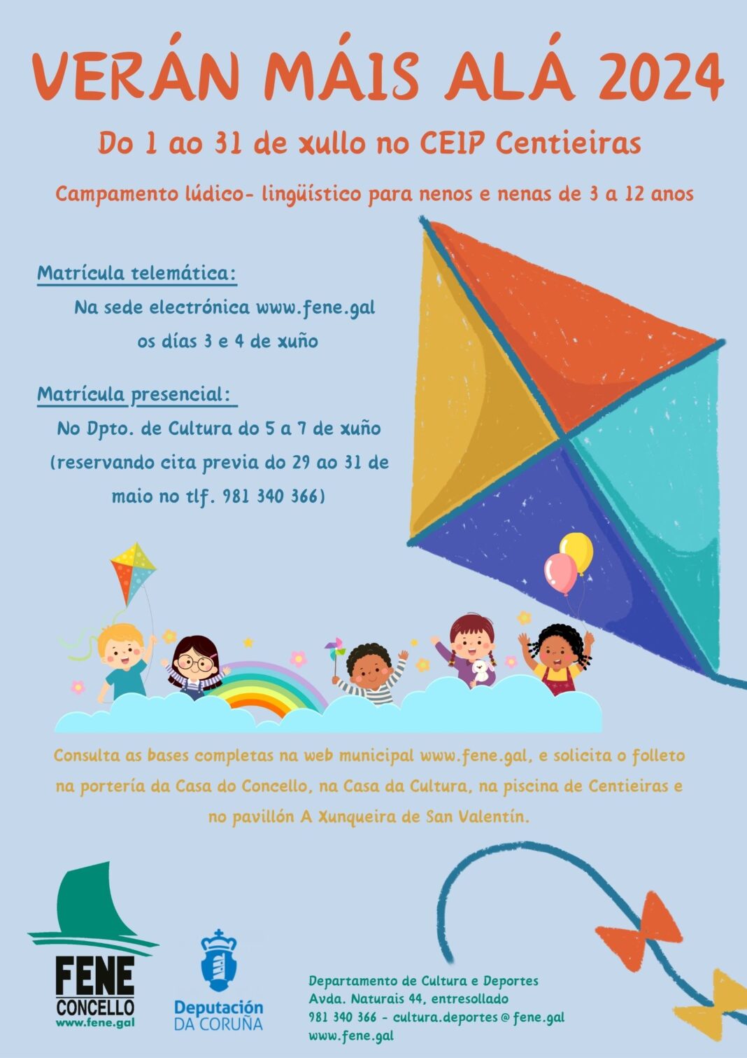 Coa publicación das bases no BOP núm 90 do xoves 9 de maio, o Concello de Fene pon en marcha unha nova convocatoria do campus lingüístico Verán Máis Alá, dirixido ao alumnado escolarizado en educación infantil e primaria nado entre os anos 2012 e 2020 (idades de referencia de 3 a 12 anos). Nesta nova edición, o campamento de verán que organiza a Concellería de Cultura desenvolverase nas instalacións do Ceip de Centieiras, do 1 ao 31 de xullo en horario de 08.00 a 14.30 horas. A matrícula provisional realizarase a partir do 3 de xuño e, á hora de inscribirse, terán prioridade os/as participantes empadroados/as no Concello de Fene (con anterioridade ao 2 de maio de 2024). Os nenos e nenas que non estean empadroados en Fene ou que non estiveran matriculados no curso académico 2023/2024 nalgún dos centros de ensino do concello non poderán participar no programa.