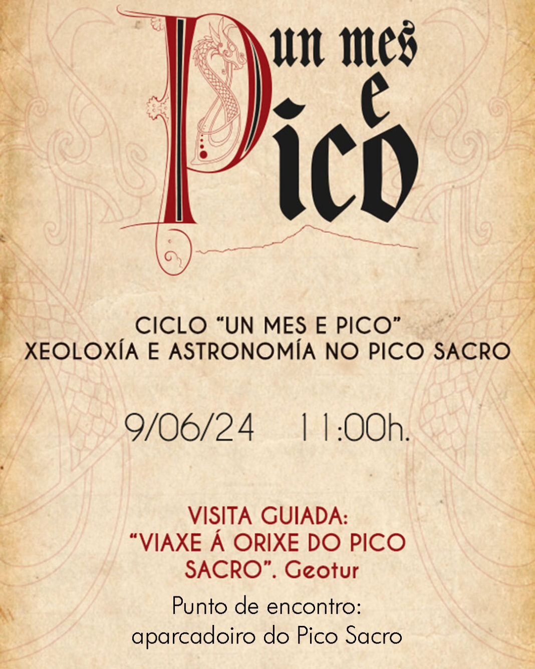 O Concello de Boqueixón abre este domingo 9 de xuño a programación do ciclo “Un mes e Pico” cunha visita xeolóxica ao monte Ilicino guiada por especialistas Geotur Galicia. “Viaxe á orixe do Pico Sacro” será un paseo pola orixe, a evolución e os elementos máis característicos da complexa historia xeolóxica e xeográfica do monte ilicino. O punto de encontro será o aparcadoiro do Pico Sacro, ás 11:00 horas.