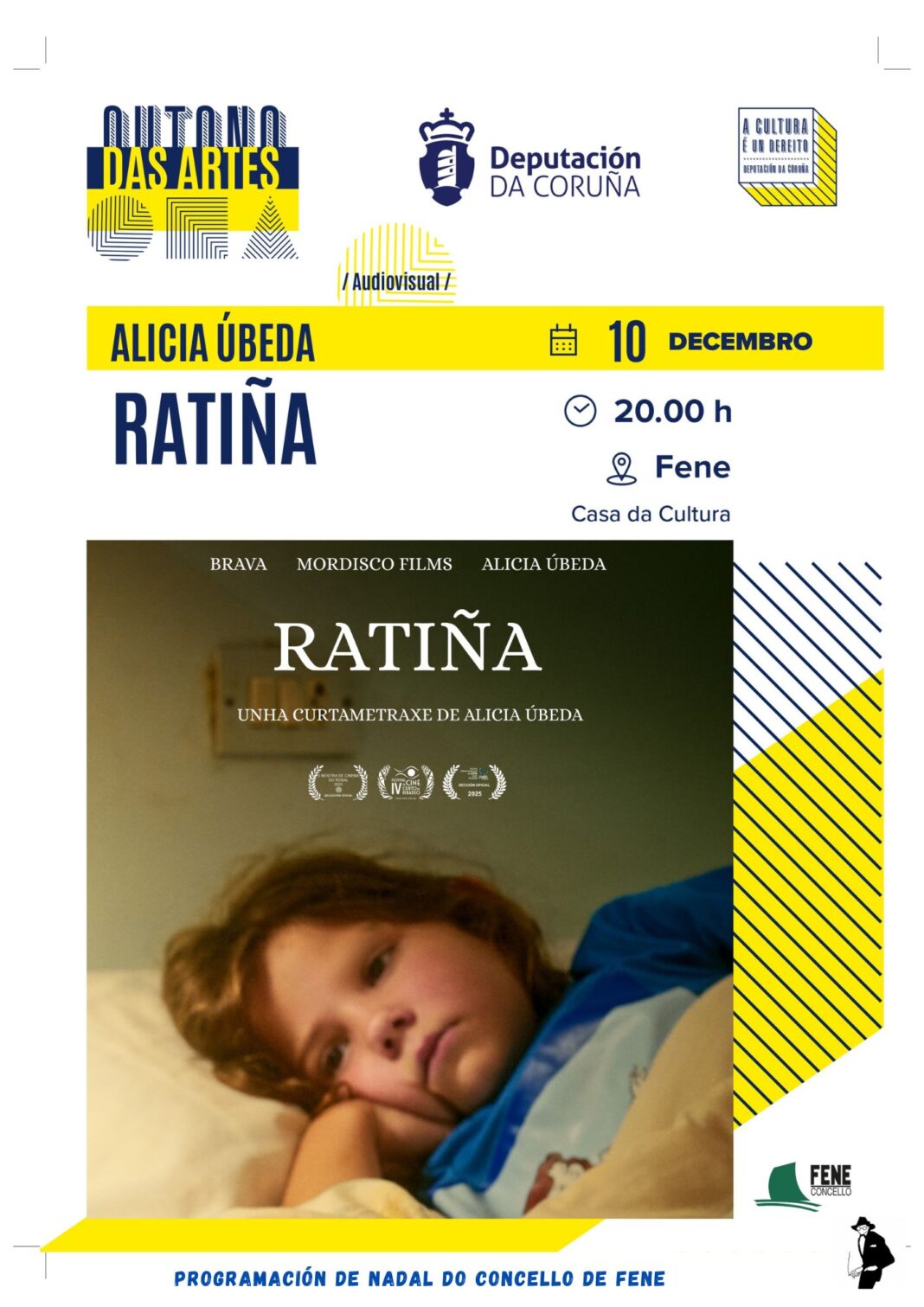 “Ratiña” é unha curtametraxe social e intimista, cunha duración de 11 minutos, que aborda temas como o acoso escolar, a xestión emocional e a relación entre nenos/as e pais/nais. A peza, que se poderá ver na Casa da Cultura o vindeiro mércores 10 de decembro, ás 20 horas, combina un enfoque minimalista e poético cunha narrativa realista, dirixida preferiblemente para o público adulto. Trala proxección do mesmo, haberá un coloquio no que poderán participar as persoas asistentes. Entrada libre e de balde.