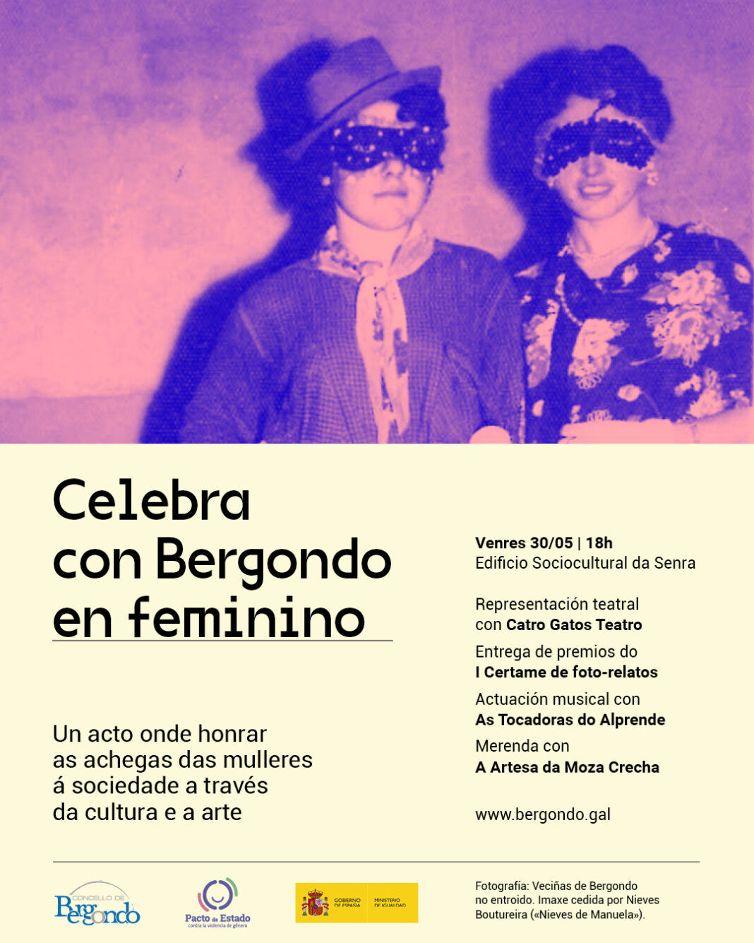 Contará cunha representación teatral a cargo da compañía Catro Gatos Teatro, seguida da entrega de premios do I Certame de foto-relatos ‘Bergondo en Feminino’, unha iniciativa que busca visibilizar historias femininas a través da fotografía e a narración.