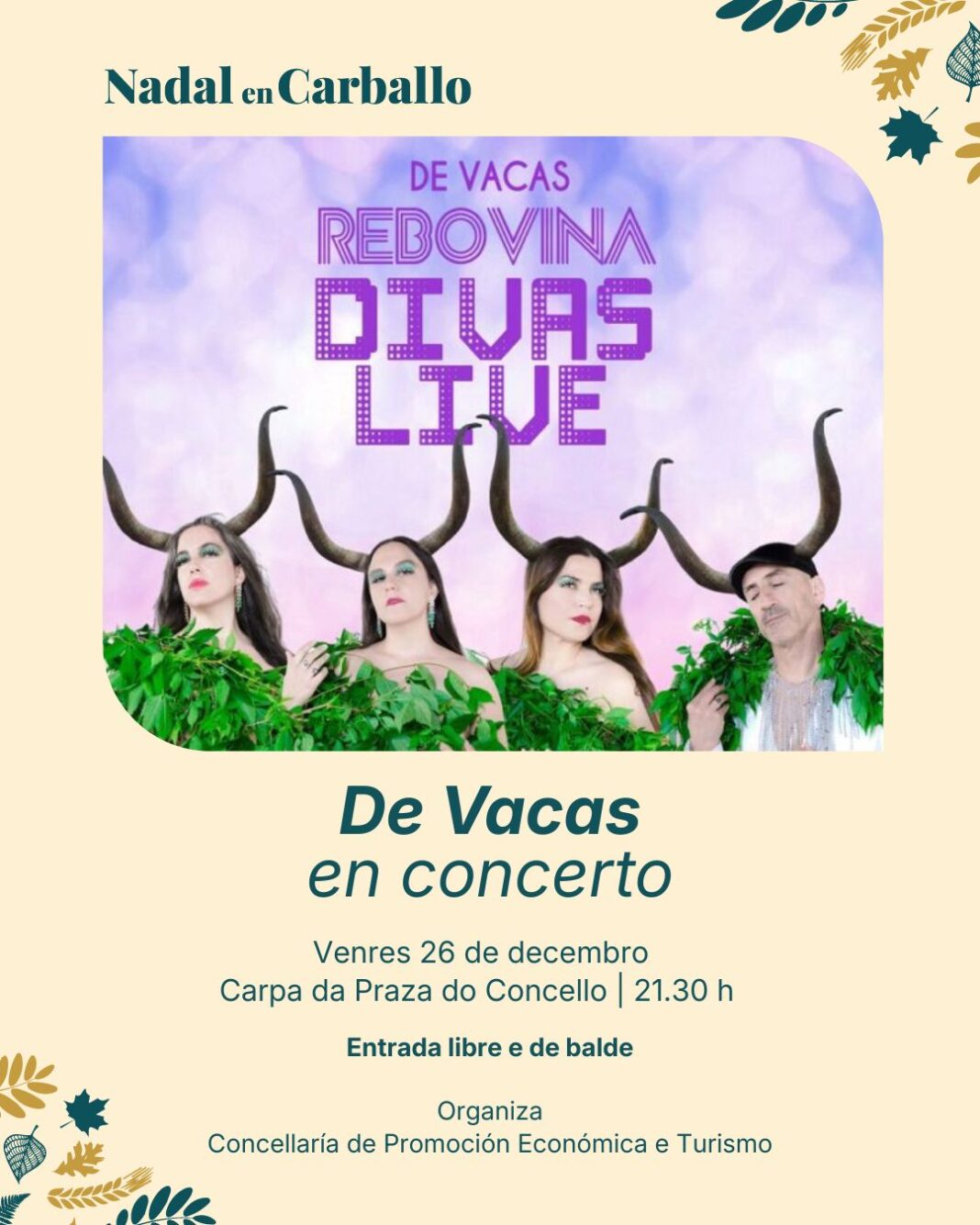 O intenso programa do Nadal en Carballo suma un novo espectáculo programado pola Concellaría de Promoción Económica e Turismo: este venres 26 de decembro teremos concerto do grupo De Vacas, que ofrecerá unha versión moi navideña do seu espectáculo Rebovina Divas Live. A formación integrada por Paula Romero, Inés Salvado, Faia Díaz e Guillermo Fernández actuará na carpa da Praza do Concello a partir das 21.30 horas.