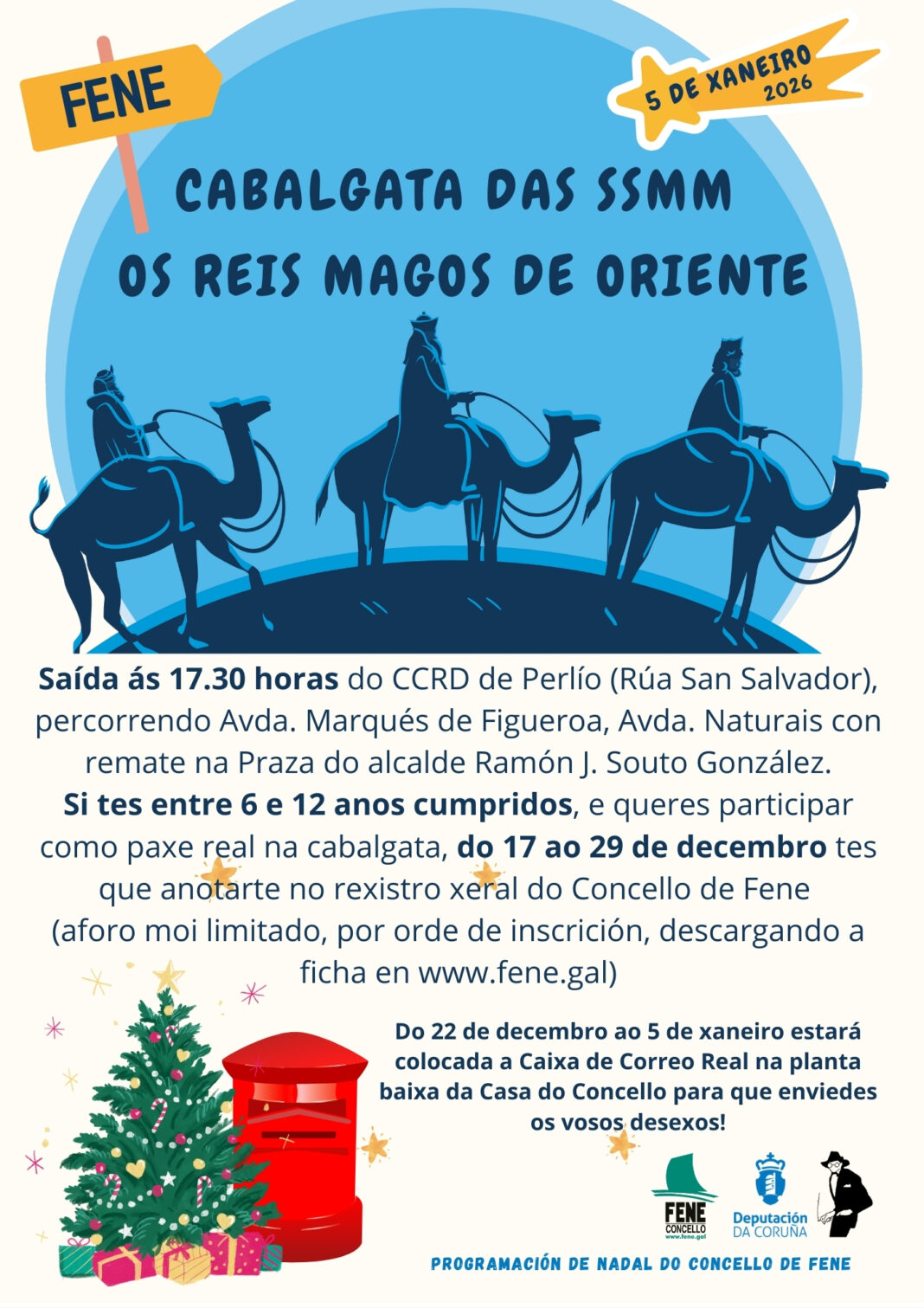 As familias dos/as pequenos, de entre 6 e 12 anos, que desexen participar como paxes reais, terán que entregar debidamente cuberto o formulario de solicitude (descargable en www.fene.gal) a partir das 8.30 horas do 17 de decembro ate as 23.59 horas do 29 de decembro. As solicitudes presentaranse presencialmente no Rexistro Xeral (2º andar da Casa do Concello), en días laborables, de luns a venres de 8:30 a 14:00 h. Tamén se poderán presentar por vía telemática na sede electrónica municipal (https://sede.fene.gal/sxc/gl/index.html) desde as 8.30 horas do 17 de decembro até finalizar o prazo establecido.