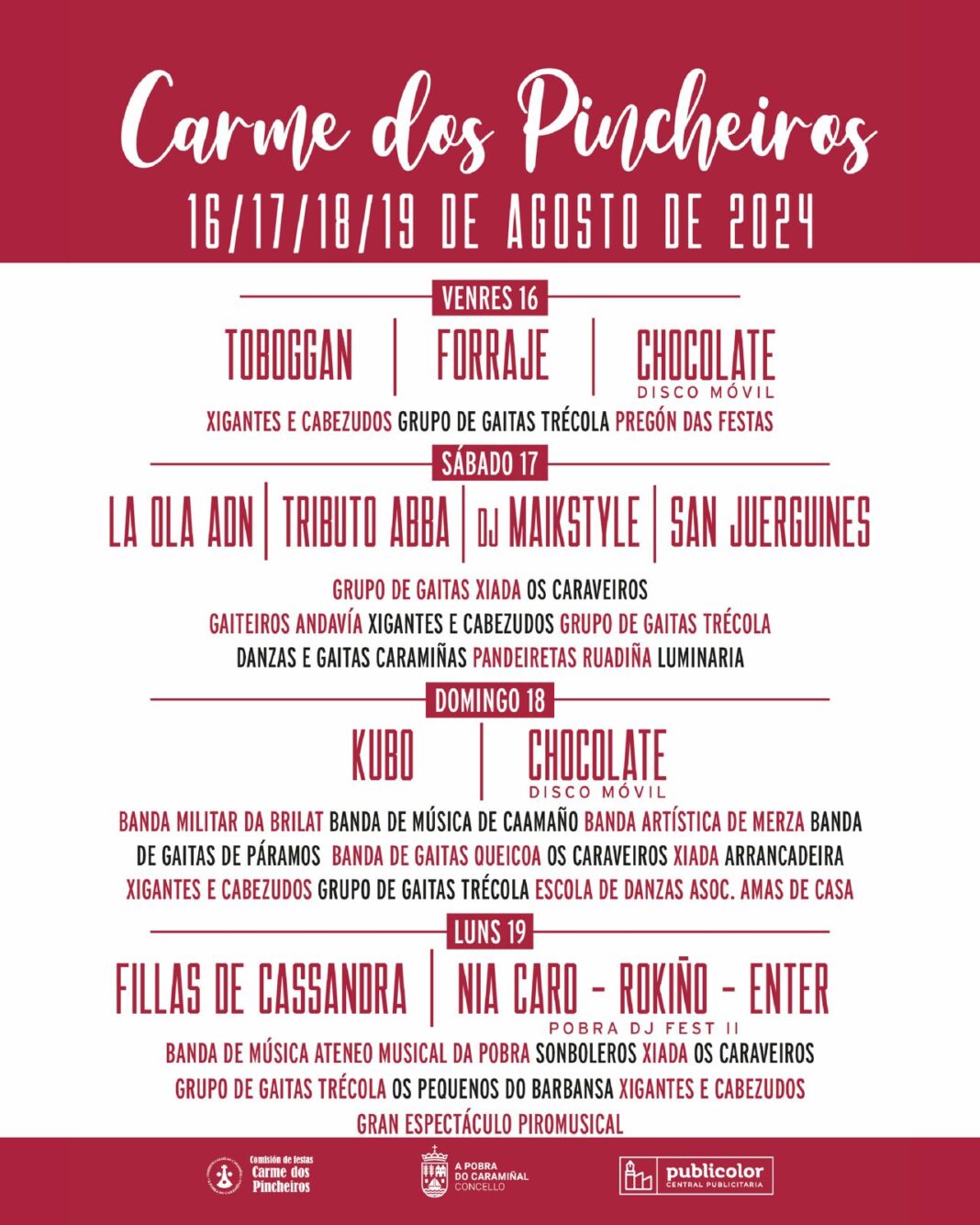 Tocará despedi-lo Carme dos Pincheiros no luns 19, festivo local, cun cartel á altura. O día comezará ás 10.00 horas coa entrada na vila e alboradas polo rural da man de Os Caraveiros, Xiada e Os Pequenos do Barbansa. A praza Alcalde Segundo Durán converterase en epicentro dunha festa infantil e festa da escuma, ás 11.00 horas. A Banda de Música Ateneo Musical da Pobra fará entrada na vila ás 12.00 horas para, máis tarde, ás 13.00 horas, tocar nos Xardíns de Valle-Inclán.