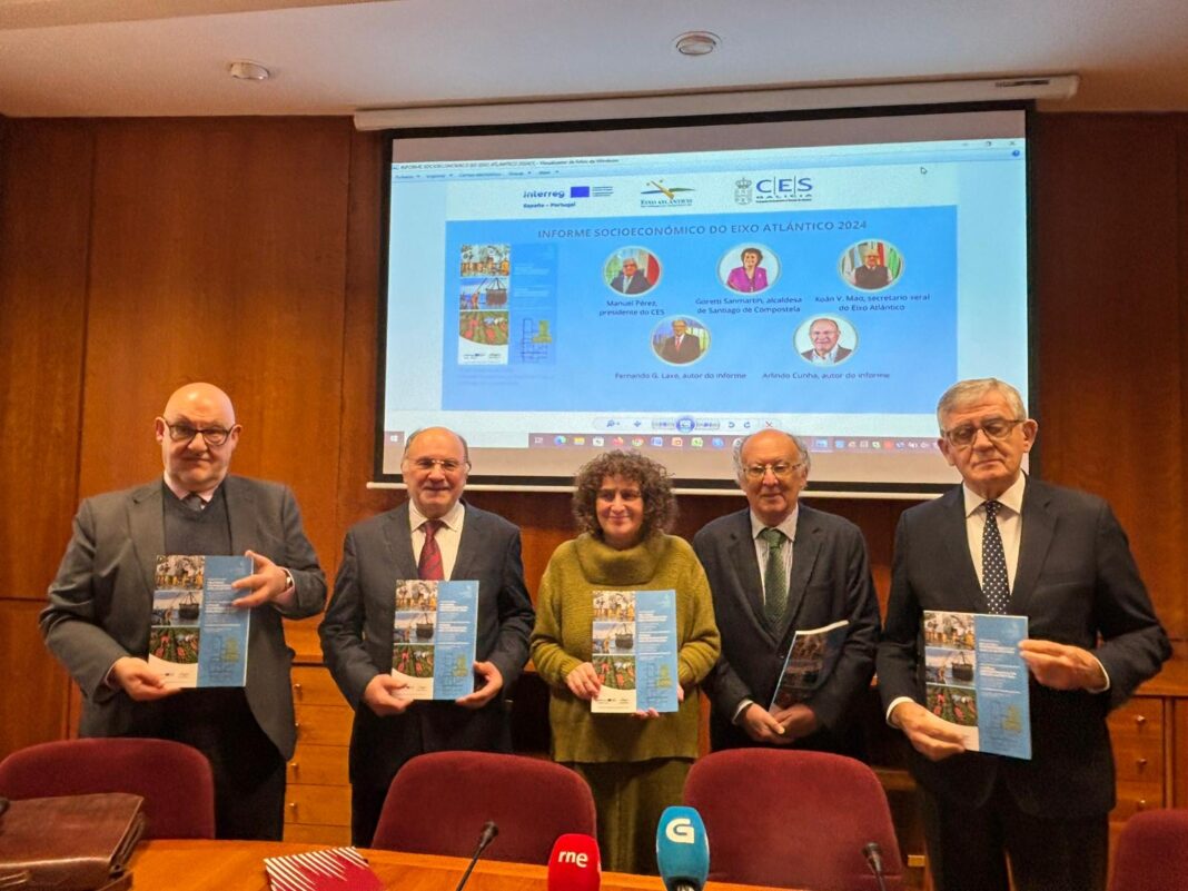 O Eixo Atlántico presentou esta mañá o Informe Socioeconómico Anual 2024, nun acto celebrado na sede do Consello Económico e Social (CES) de Santiago de Compostela, no que participou a rexedora compostelá, Goretti Sanmartín. O informe foi elaborado por Fernando González Laxe, catedrático emérito de Economía Aplicada na Universidade da Coruña e expresidente da Xunta de Galicia; e Arlindo Cunha, catedrático de Economía da Universidade Católica do Porto, quen tamén foi ministrode Agricultura no goberno de Cavaco Silva e ministro das Cidades no goberno de Durão Barroso.