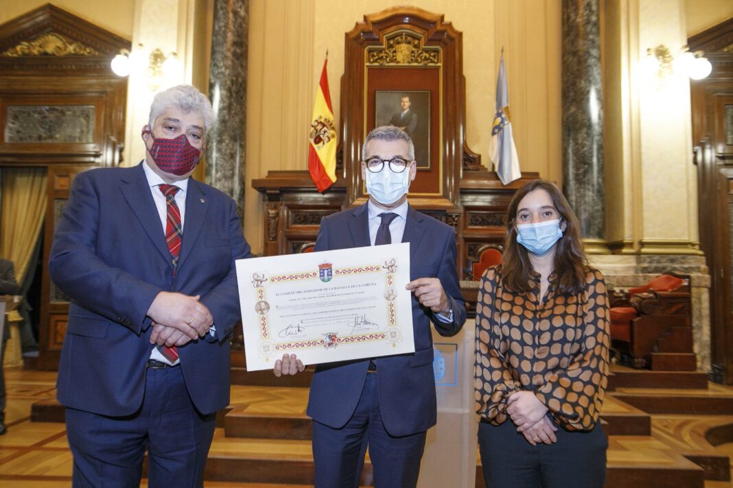 A alcaldesa, Inés Rey, presidiu esta mañá no salón de plenos, xunto ao presidente da Asociación Histórico Cultural The Royal Green Jackets, Manuel Arenas, o acto de entrega da medalla de ouro da batalla de Elviña que a entidade lle outorga este ano ao persoal a área sanitaria da Coruña.e Cee, Complexo Hospitalario Universitario de A Coruña.