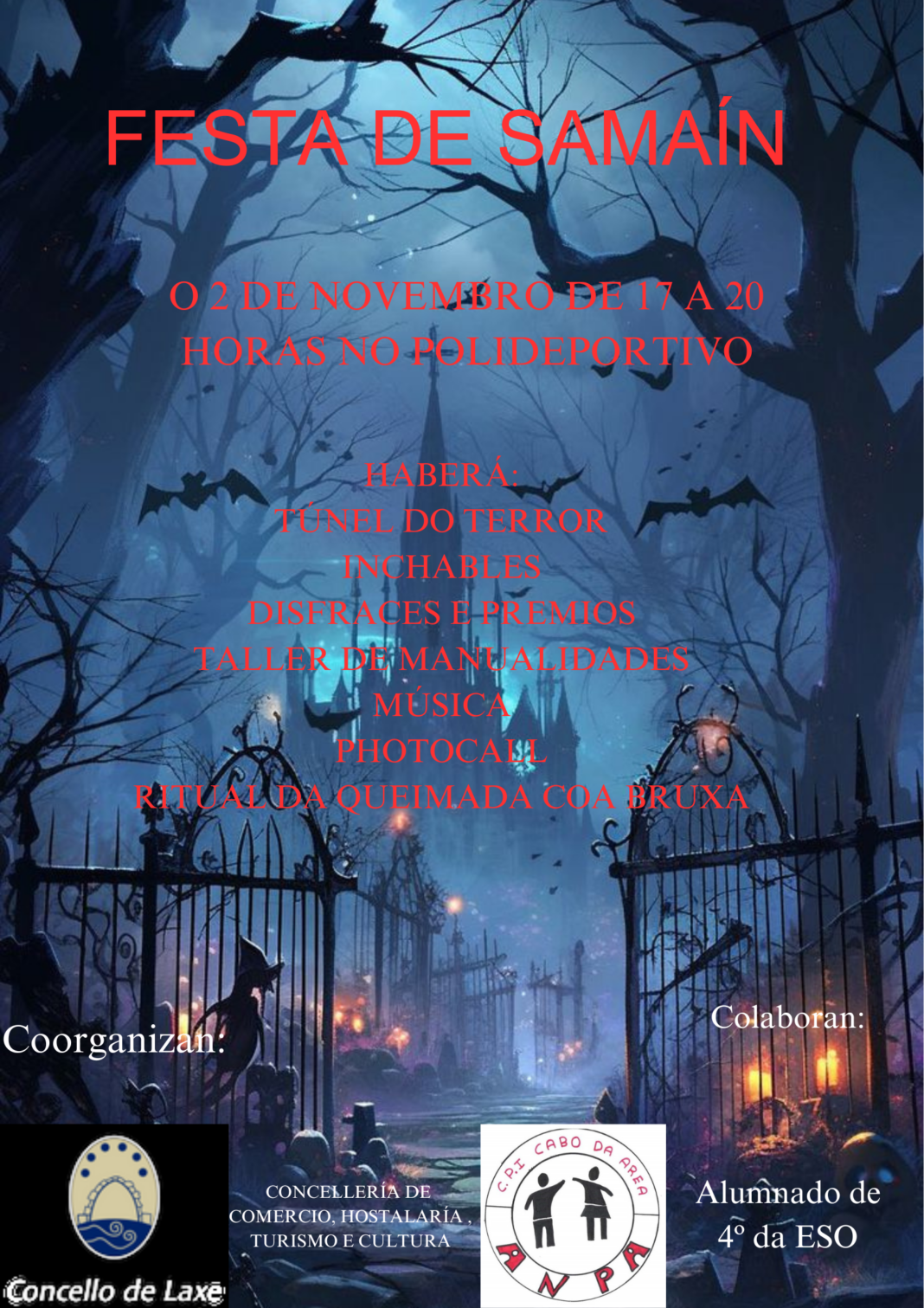 O Concello de Laxe celebrará o vindeiro sábado, 2 de novembro, a súa gran ‘Festa de Samaín’, que conta coa colaboración do alumnado de 4º da ESO do CPI Cabo da Area.