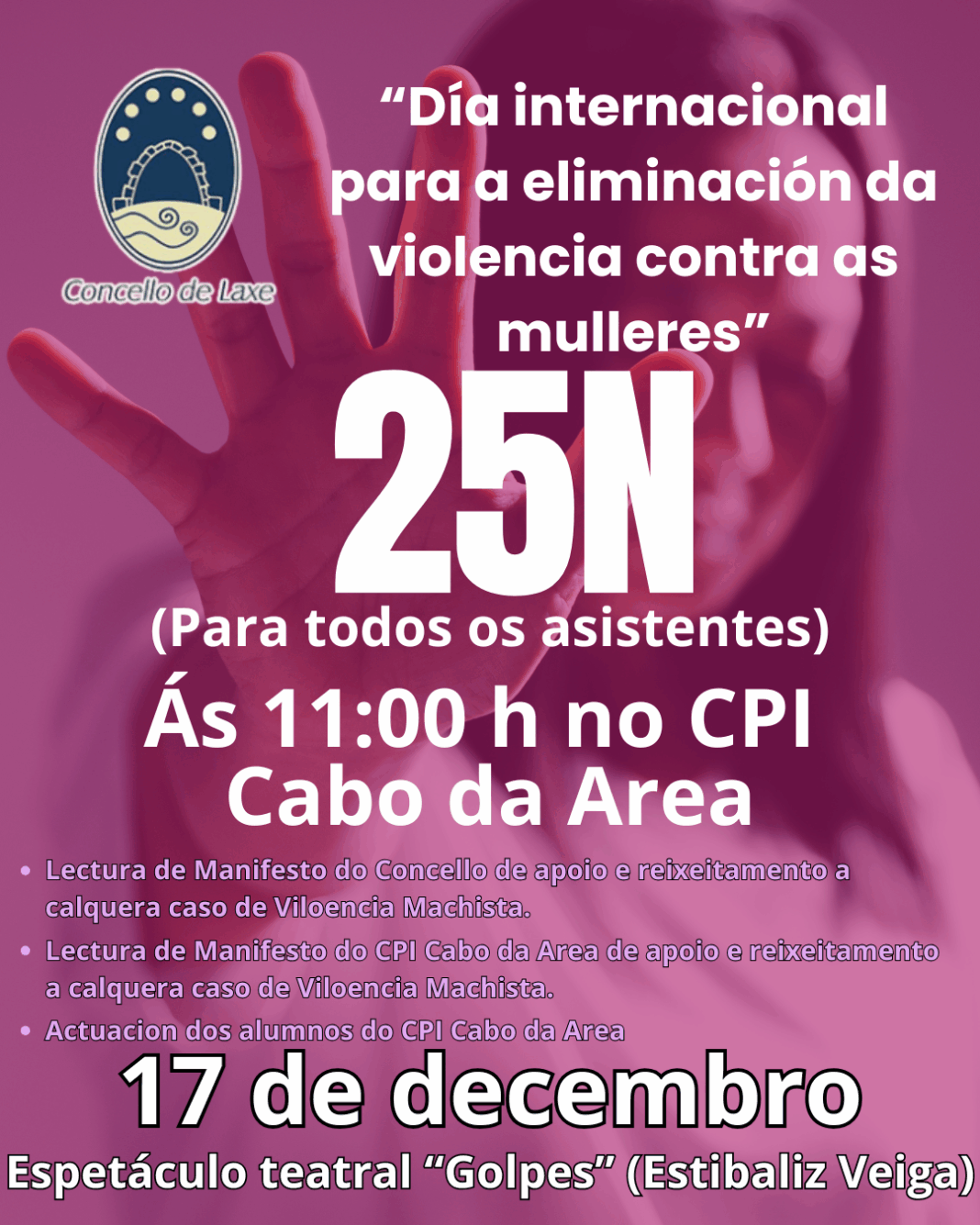 Ademais, infórmase de que o 17 de decembro, o CPI Cabo da Area programará no centro o espectáculo teatral “Golpes”, da actriz Estíbaliz Veiga, no marco da súa actividade educativa de sensibilización relacionada co 25N.