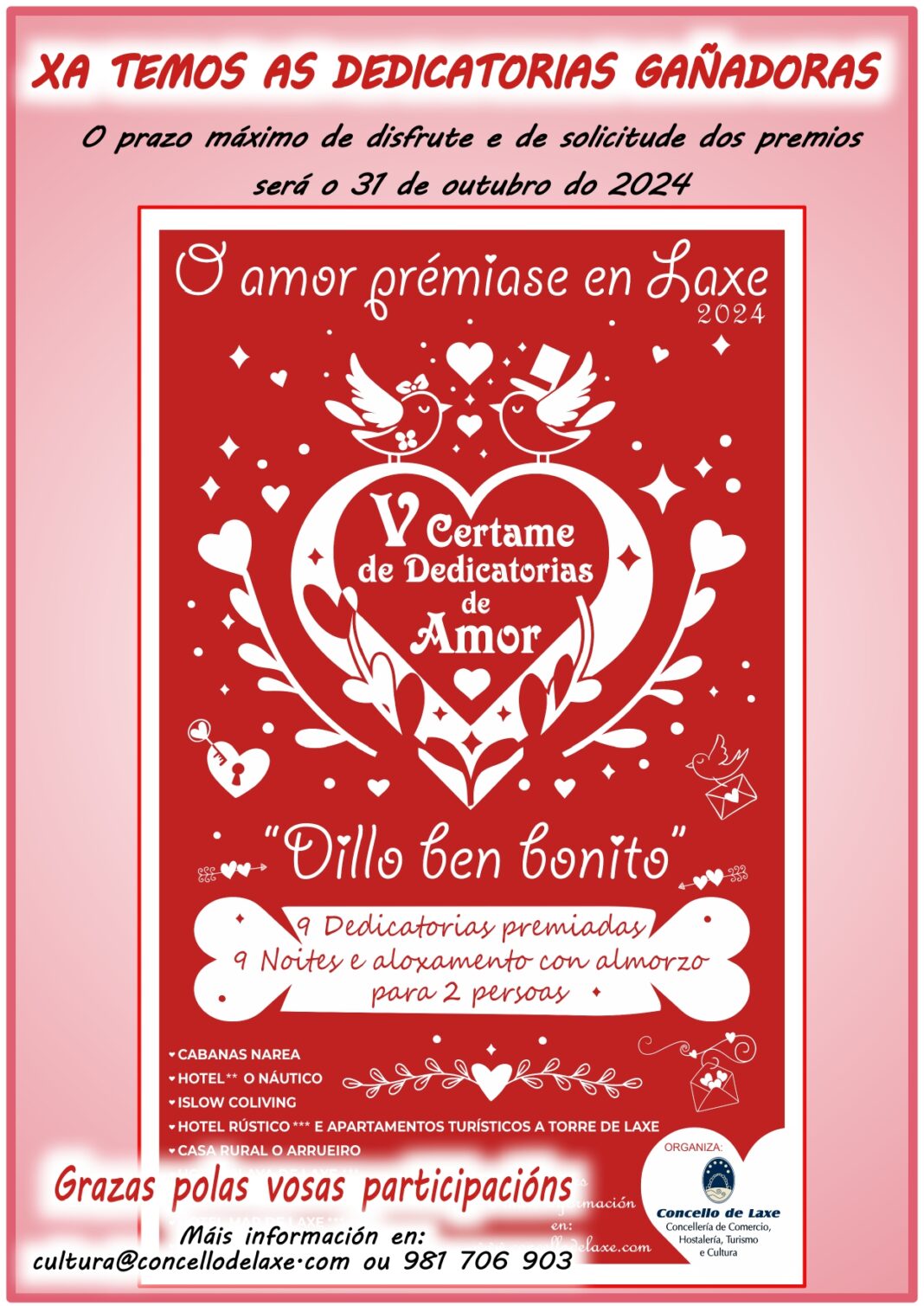 O Concello de Laxe publicou a relación de gañadores da quinta edición do certame ‘Dillo ben bonito: O amor prémiase en Laxe’.