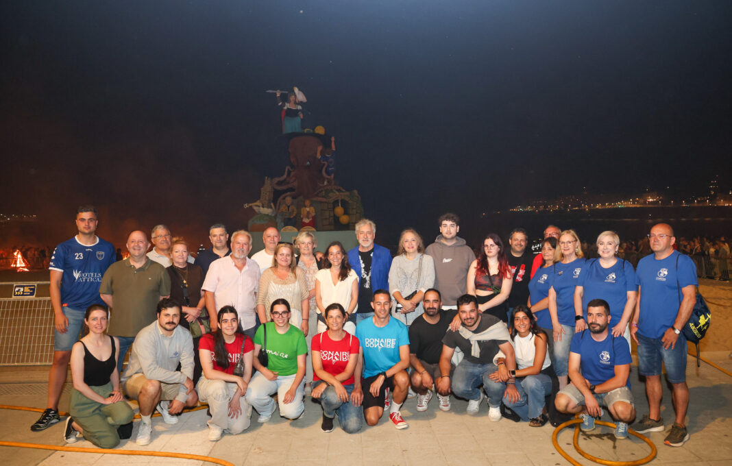 A alcaldesa, Inés Rey, presidiu o acto de acendido da falla na praia de Riazor. Fíxoo acompañada por Manuel Rivas, cuxa figura está presente na falla como homenaxe ao Premio Nacional das Letras 2024. Tamén estiveron presentes Carlos Resch e Diego Martínez, presidente e capitán do OAR Coruña. Por outra banda, tamén estiveron presentes familiares e achegados/as das cantareiras homenaxeadas no pasado Día das Letras Galegas Participaron Felicidad Casás, Rosa Casás, Jesús Casás, Montserrat Casás, Richi Casás e Rafa Casás, netos de Rosa Casás; Manuel García Casás, neto de Adolfina Casás; Juan José Alvite Castiñeira, fillo de Eva Castiñeira; e Isabel García, presidenta de Aturuxo. Tamén estiveron presentes representantes de distintas agrupacións de música tradicional da cidade: Aturuxo, Donaire, Xacarandaina, Cántigas da Terra, Son d’aquí e Pansenfron.