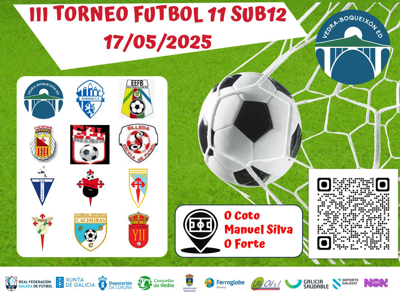 O III Torneo de Fútbol 11 Sub 12 terá lugar o sábado 17 de maio de 2025 nos campos municipais de O Coto e Manuel Silva (Vedra) e O Forte (Boqueixón). Nel tomarán parte máis de 250 nenos e nenas de doce equipos: Amio SD, CD Conxo Santiago, SD Compostela, Victoria FC e SD Villestreo (Santiago), SD Touro (Touro), SD Cacheiras (Teo), Escola de Fútbol Silleda (Silleda), Escola de Fútbol Lalín (Lalín), Escola Estrada de Fútbol (A Estrada), Ourense CF (Ourense) e os locais da Escola Deportiva Vedra-Boqueixón.